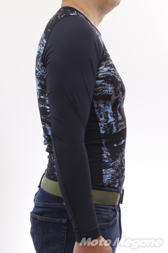 着用した瞬間に清涼感はあったのだが、真価は走行時にあった。袖口や襟元から入ってくる風で上半身がものすごいひんやり感につつまれる。 ただ、風に当たらないと冷えないので、メッシュウェアを着るか、袖口やなど風の通り道を確保したジャケットの着方をするのがマストだ。