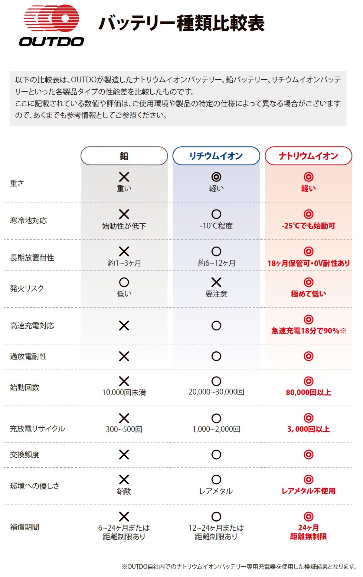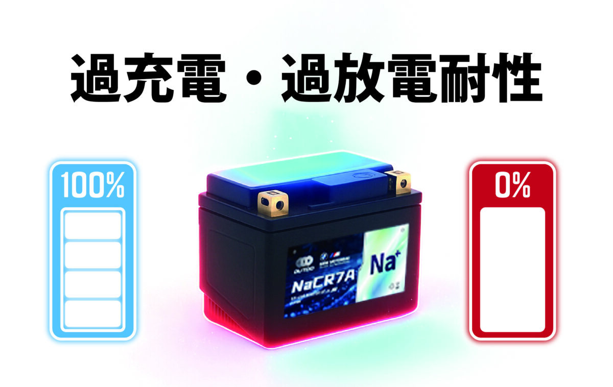 OUTDOナトリウムイオンは、過放電、過充電による損傷が出にくい特性を持っている。