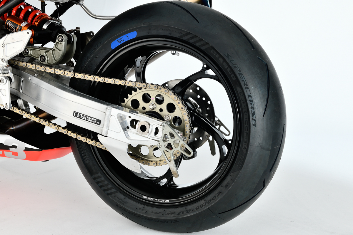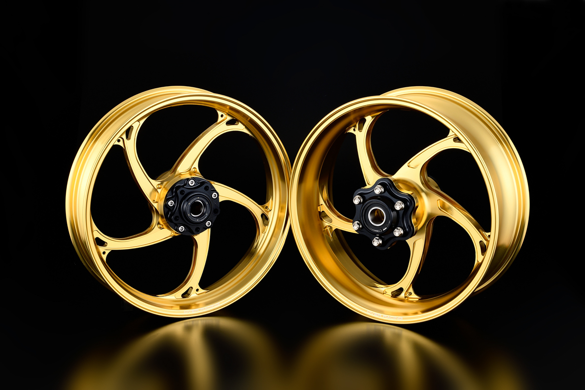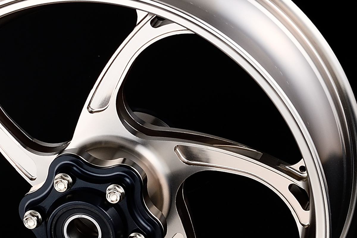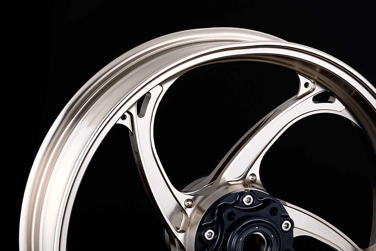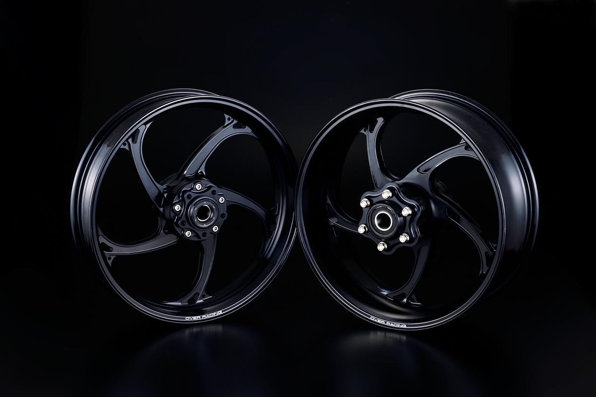 そんな超ハイスペックマシンの運動性能をさらに引き出すために自社開発されたのが、オーヴァーレーシングの17インチ径GPホイールとしては第二弾となる「GP-V」。同じくカワサキのZ900RS用もリリースされている第一弾の「GP-XX」が、クラシカルな雰囲気もあるY字20本スポークを採用するのに対し、「GP-V」は剛性としなやかさを両立させた、弧を描く5本スポーク形状を特徴とする。
