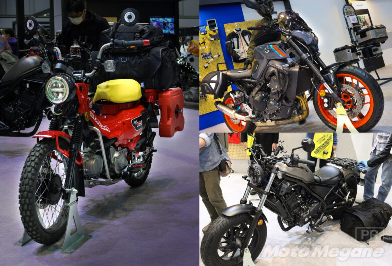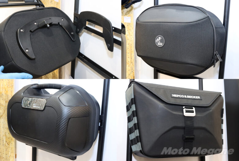 「C-BOW」のマウントに装着できるバッグが4種類展示された。車種や好みや用途に応じて、1つのマウントで様々なバッグを使い分けることができる。