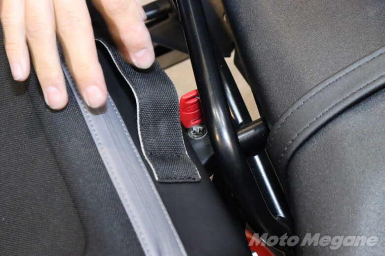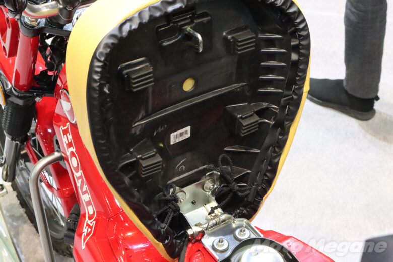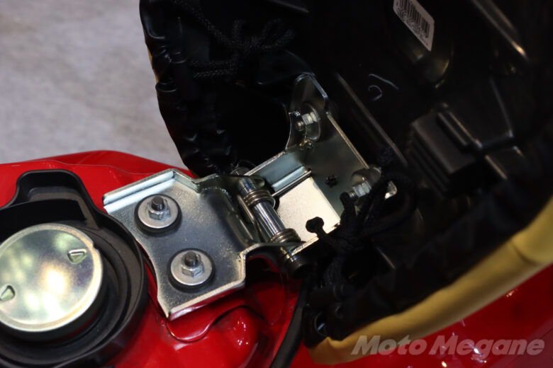 シートのロックを解除するとバネの力で自動的にシートを跳ね上げてくれる「プルアップシートオープナー」は参考出品だが発売予定だという。給油時にもシートが勝手に倒れてくることもなく、便利な商品だ!