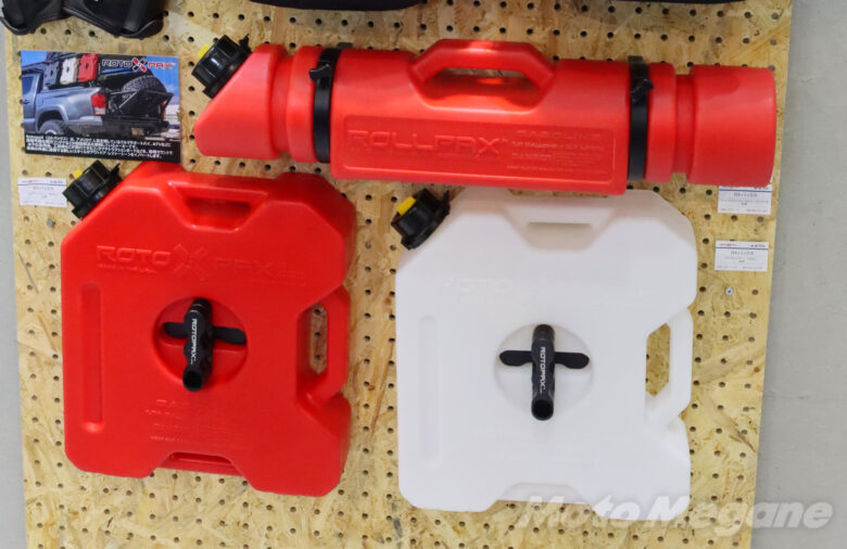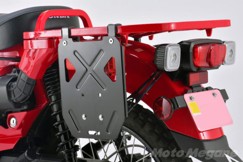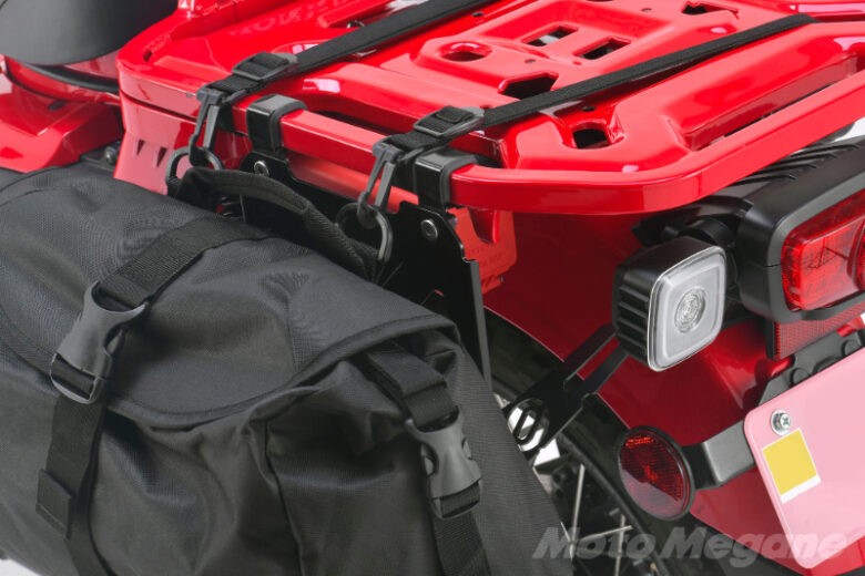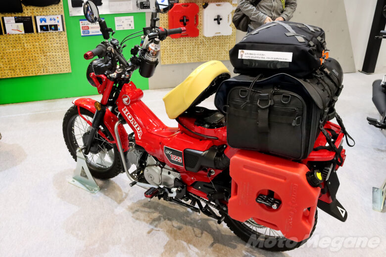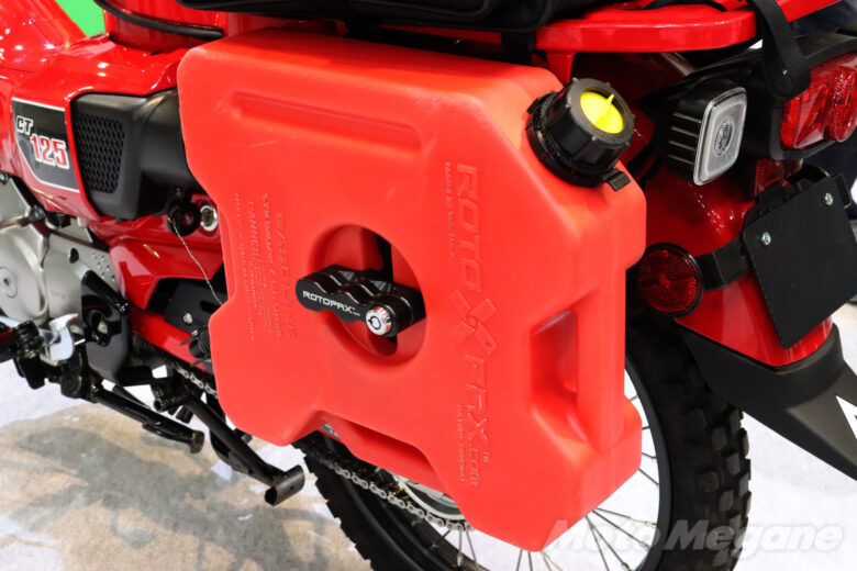 CT125のワイルドな魅力が高める「RotopaX レッドコンテナ」を搭載。日本の法規上ガソリンは入れられないが、水を入れておけばキャンプや釣りなどアウトドアレジャーの時に便利だ。