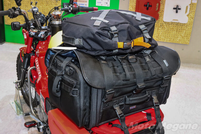 キャリアに積まれたシートバッグの下側は「IGAYA(イガヤ)キャンプツーリングシートバッグ 50-64L」。コアなツーリングファンが絶大な信頼を寄せる逸品のバッグだ。キャリアの大きなCT125には大型サイズのバッグもピッタリマッチしている。