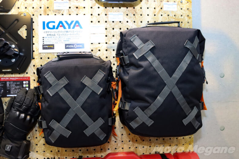 キャンプツーリングシートバッグ の上に積載されるのが同じくIGAYAの「エックスシートバッグ」。サイズは10リットルと20リットルの2種類をラインナップする。発売予定商品だ。