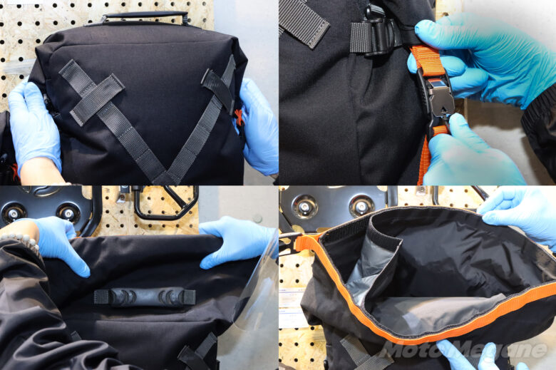 バッグ正面のX(エックス)字のウェビングにカラビナを固定したり、荷物固定用のコードを通して利用することもできる。蓋はロール式でマグネットのワンタッチ固定金具が使われているので、グローブをしたままでもバッグの開閉は容易。バッグのインナーは取り外し式の二重構造になっており完全防水!簡単に外して洗うこともできる。