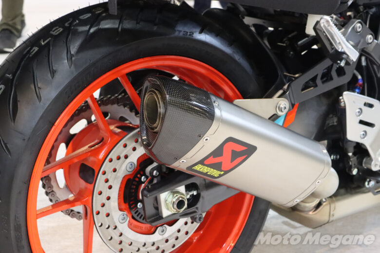 アクラポビッチの「レーシングライン チタン」マフラーは、JMCA認証マフラーなので、安心して装着できる。レーシーなデザインで、純正とは大きく印象が変わるのもポイントだ!