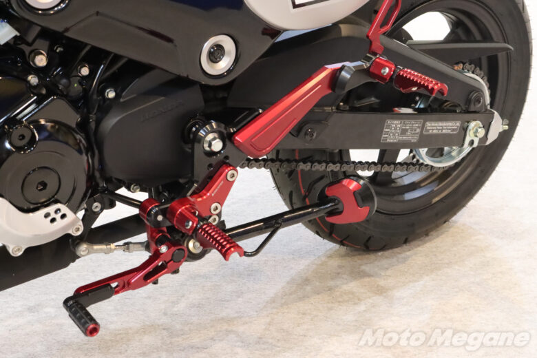 エンジンのカバー類やステップにレッドアルマイトが鮮やかなビレットパーツ類を多様することで、カスタムムードが高められている。