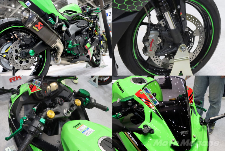 ZX-25Rは、鮮やかな発色のアルミビレットパーツを車体各所に配置し、効果的にドレスアップ!さらにブレンボのモノブロックキャリパーとAKRAPOVIC 「レーシングライン カーボン JMCA」で走りの鋭さに磨きをかけた。