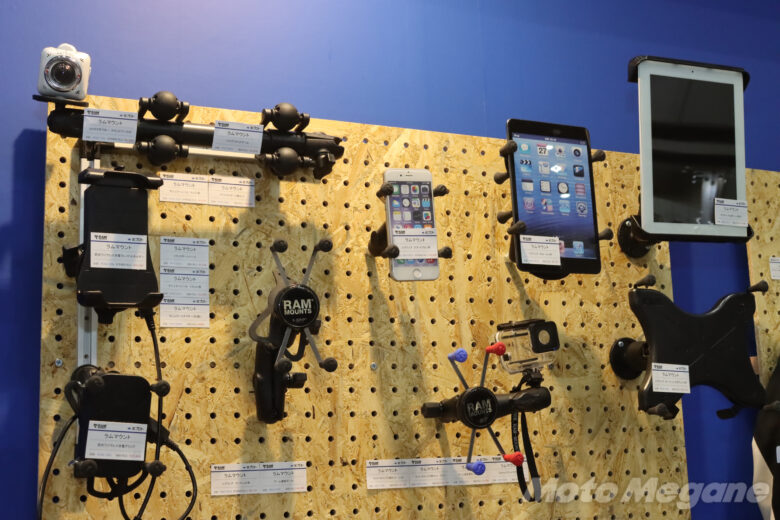 スマートフォンだけでなく、アクションカメラやタブレットなど、様々なデジタルガジェットをバイクや車にマウントできるRAM MOUNTS(ラムマウント)コーナーも設けられた。X字に配されたアームでしっかりホールドできるラムマウントはロングセラーの人気商品だ。
