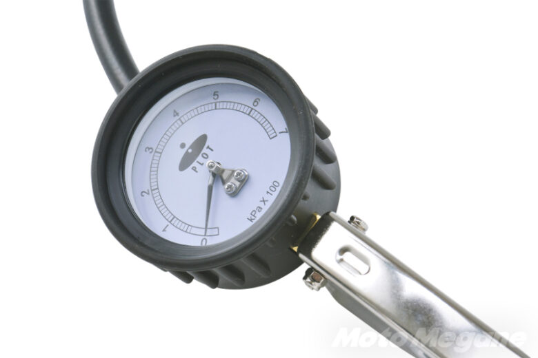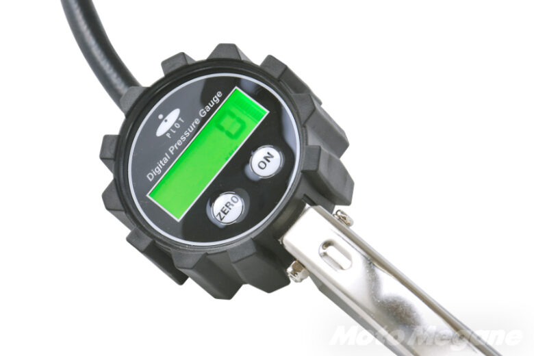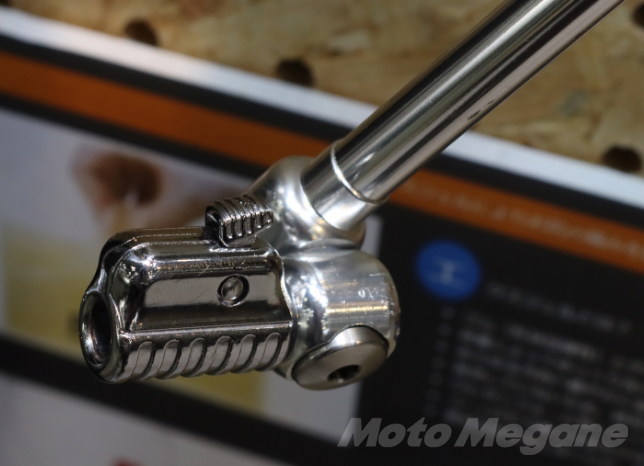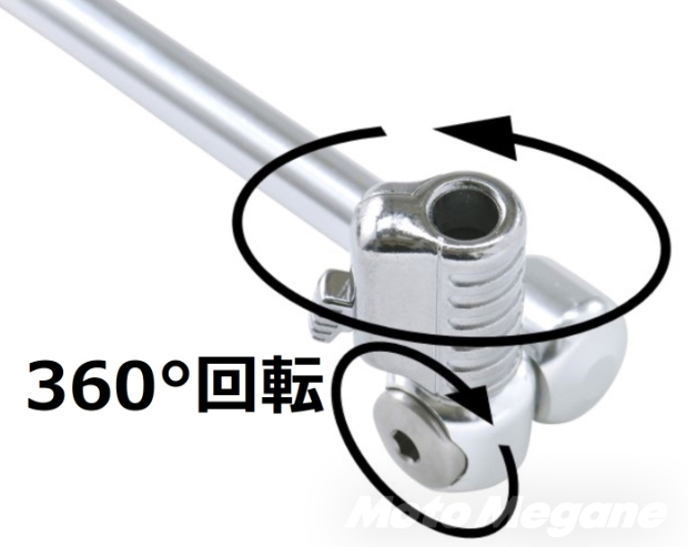 特許構造のオートエアチャックでバルブに挿し込むだけでバルブにホールド完了。さらにエアチャック先端は360度回転するので、エアバルブ周辺にスペースの少ないバイクでも、エアチェックや空気圧の調整が容易。