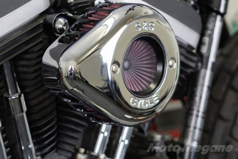 スポーツスター07-21用エスアンドエスの「AirStinger A/C Teardrop CHR」は、カバー上面にもスリットが設けられており、吸気量を確保。パフォーマンスアップに貢献する。クロームメッキのカバーでドレスアップ効果も高い。
