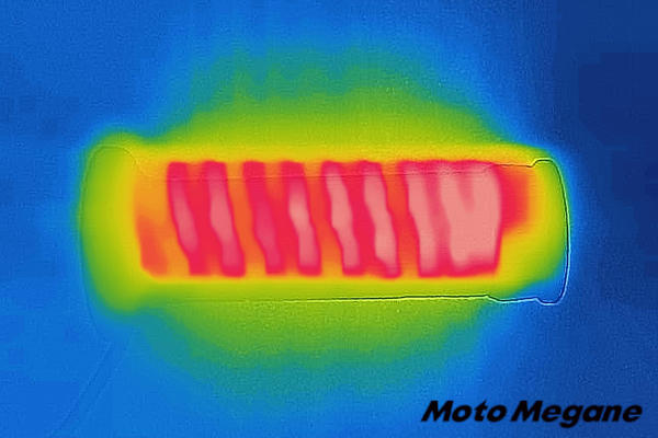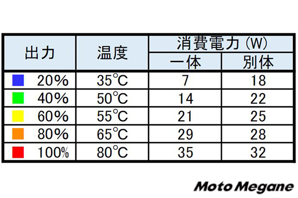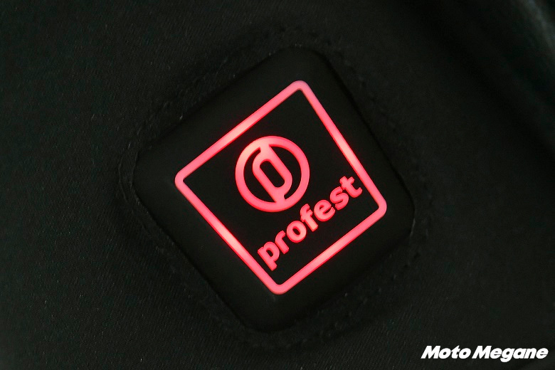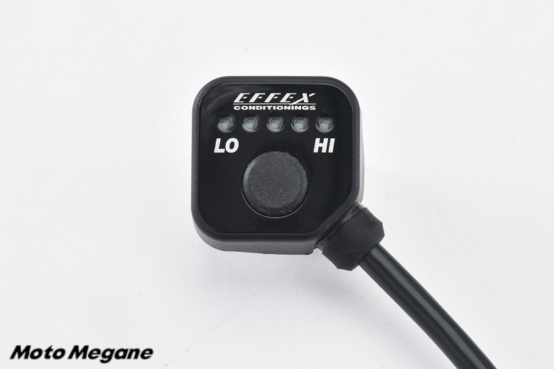 5段階で調節可能な温度の表示は、スイッチボックスに並んだ5つのLEDランプが点灯する数で判断する仕組み。スイッチONから温度調節、スイッチOFFまで、ひとつのボタンのみで操作できるシンプルな構造なので、ライディングに集中しやすい。