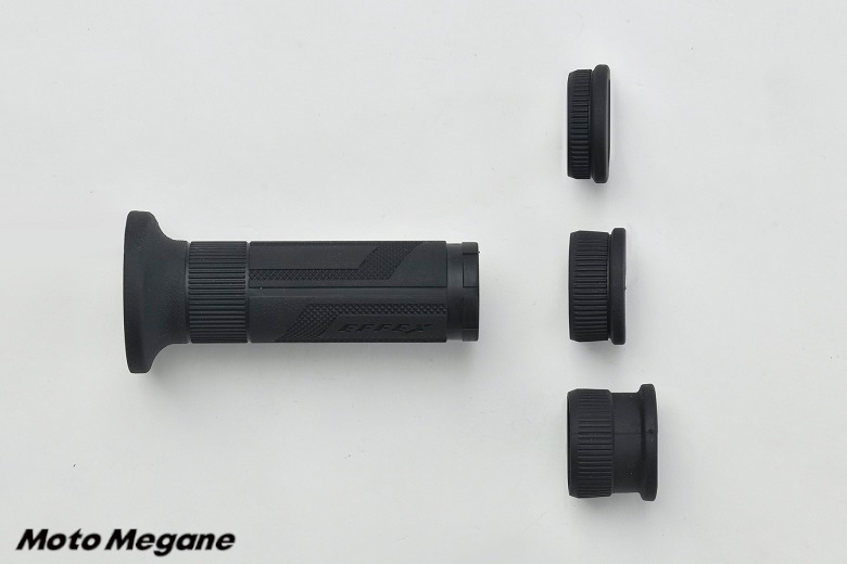 3種類のエクステンドスリーブが付属されているのでグリップ長が115/120/130mmに調整でき、さまざまな種類のオートバイに装着することができる。また、バーエンドキャップは着脱可能なので、バーエンドタイプと非貫通タイプどちらにも対応できる。
