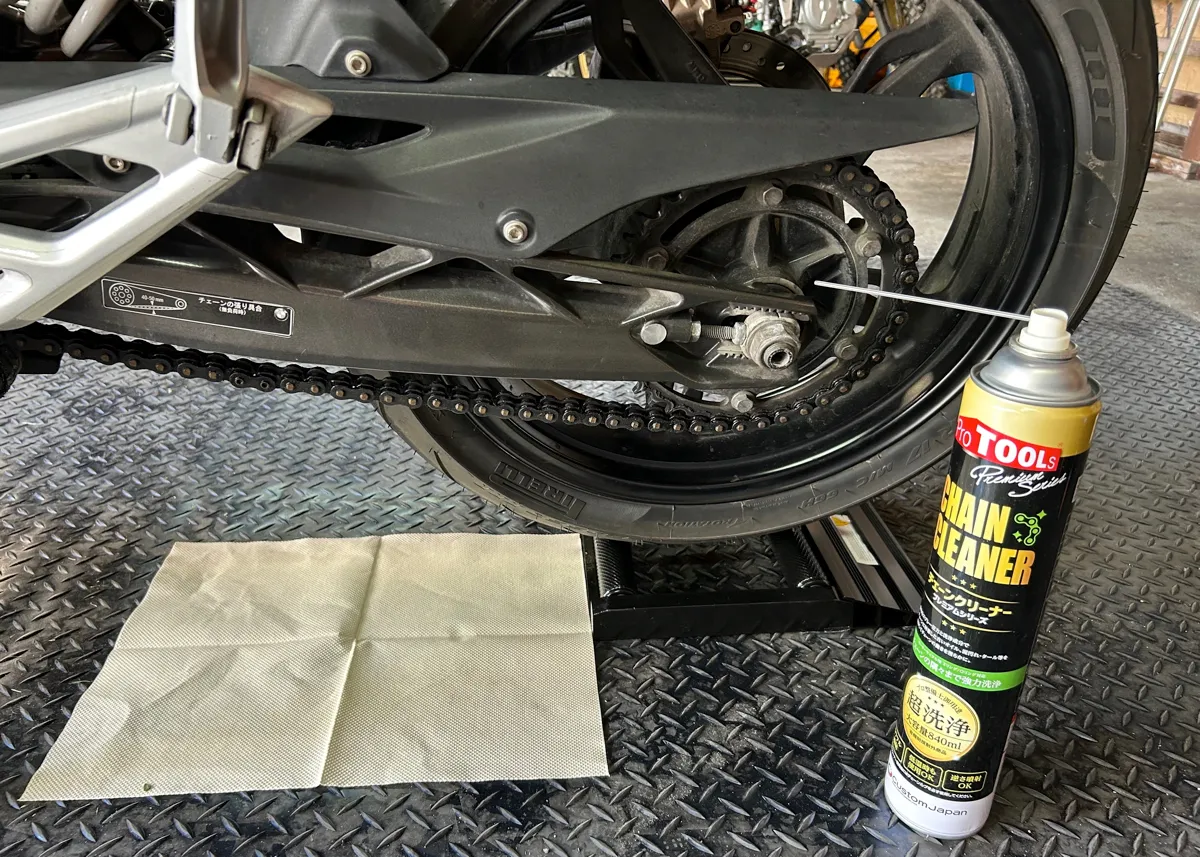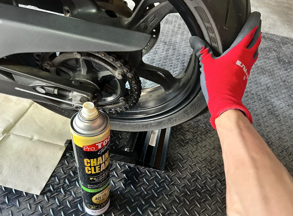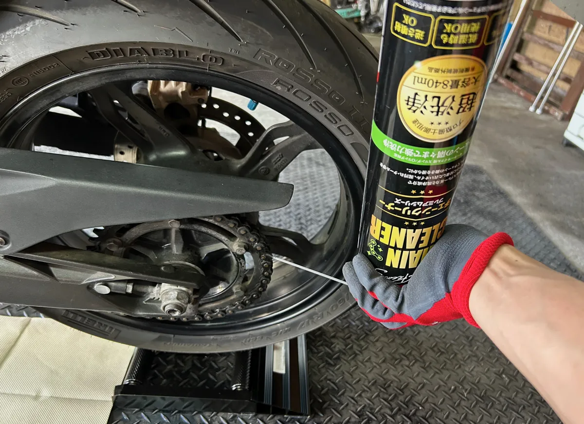 バイクを後輪クルクル状態にできたら、後はチェーンクリーナーを吹き付けるだけなので….チェーンの表面やリンク部分にも入念にシュシュっと吹きかけちゃいましょう!