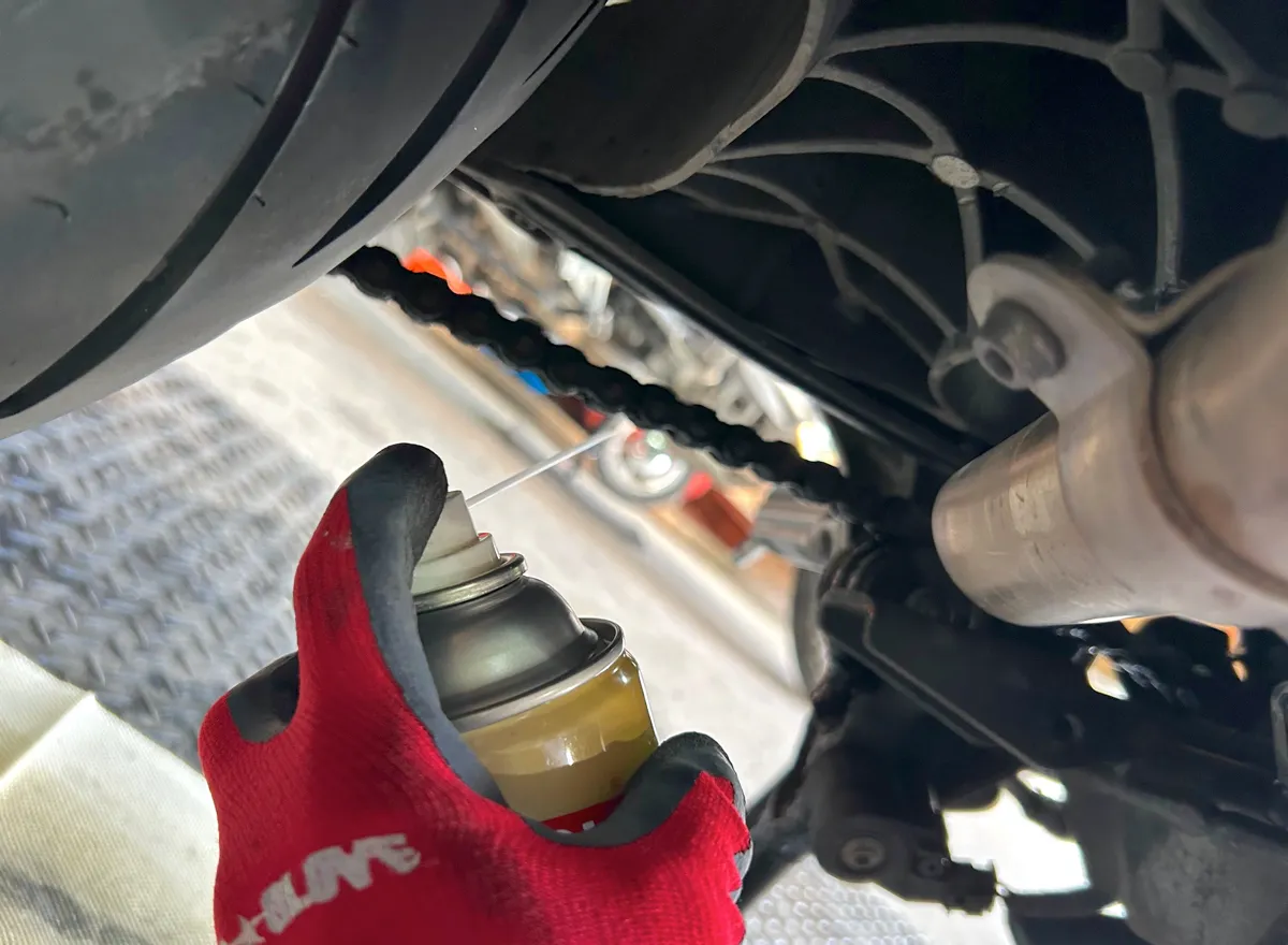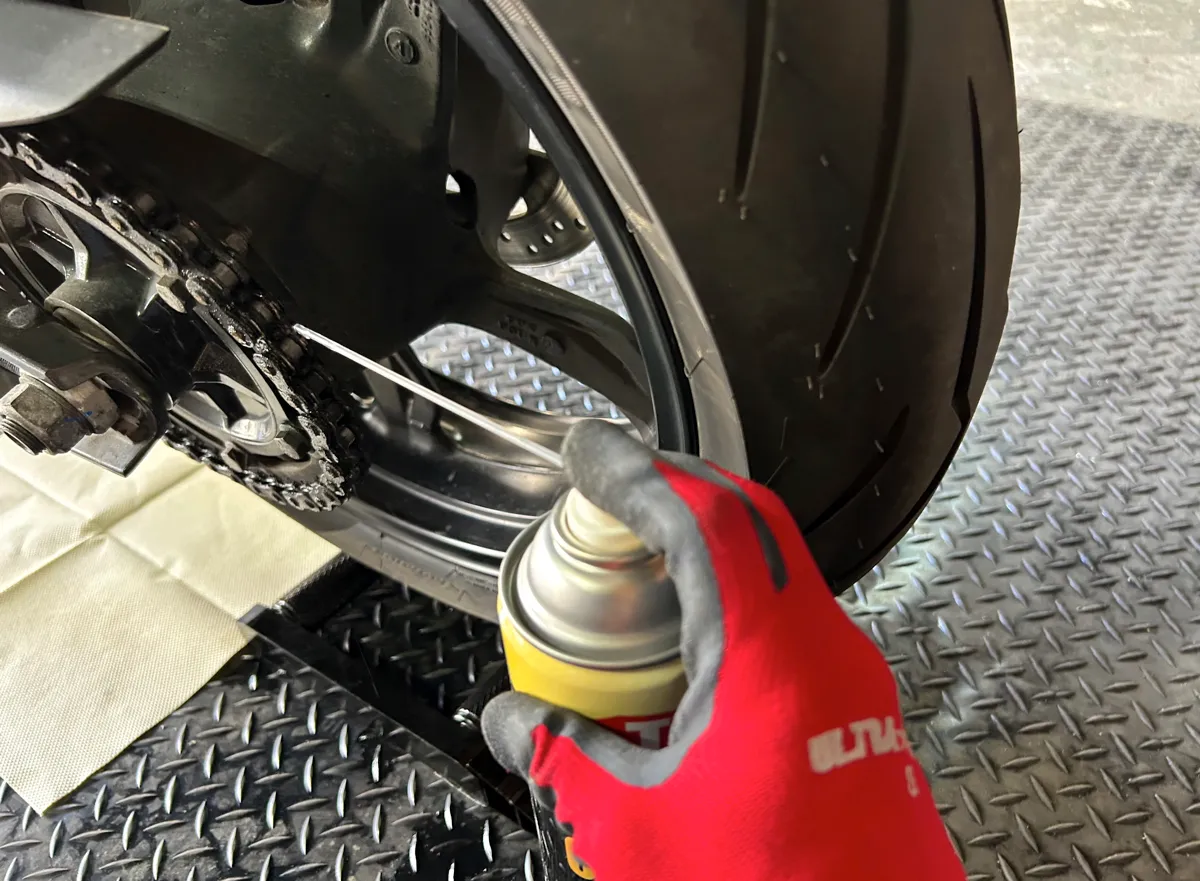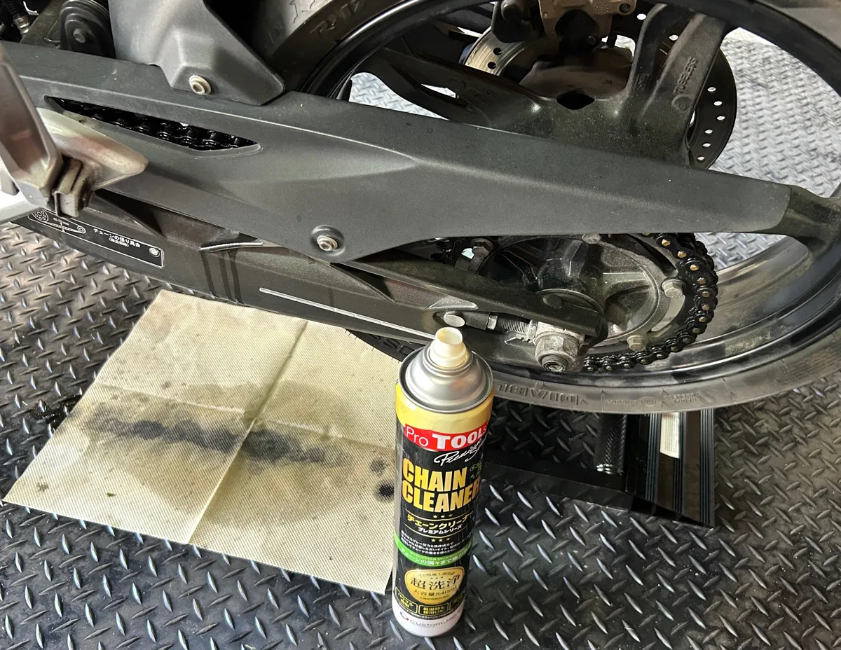 バイクを後輪クルクル状態にできたら、後はチェーンクリーナーを吹き付けるだけなので….チェーンの表面やリンク部分にも入念にシュシュっと吹きかけちゃいましょう!