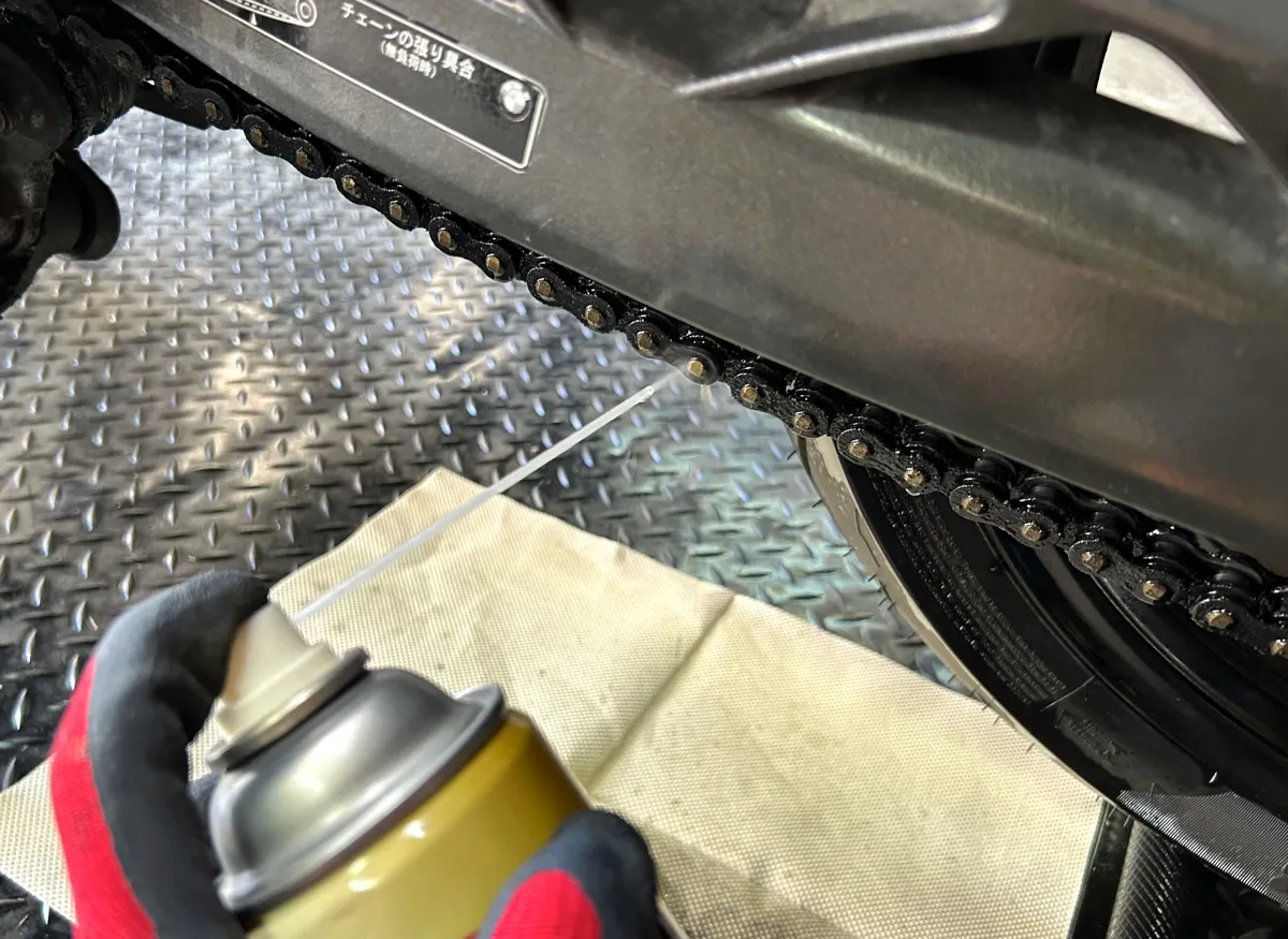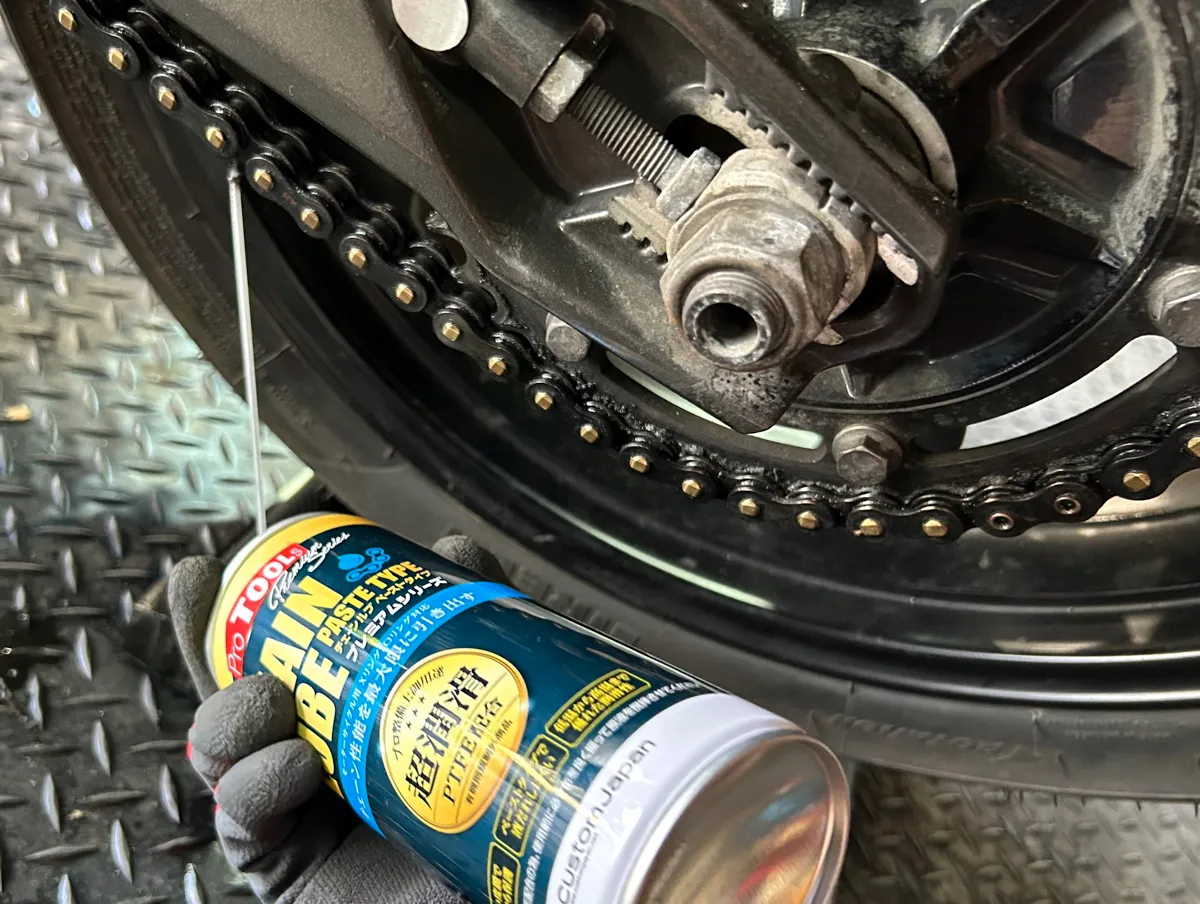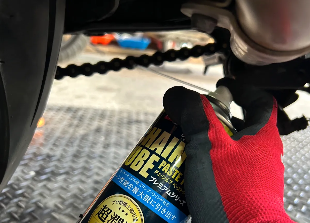見事にキレイキレイになった奥様バイクのチェーンに、プロ仕様のチェーンルブを満遍なく吹きかけていきます!