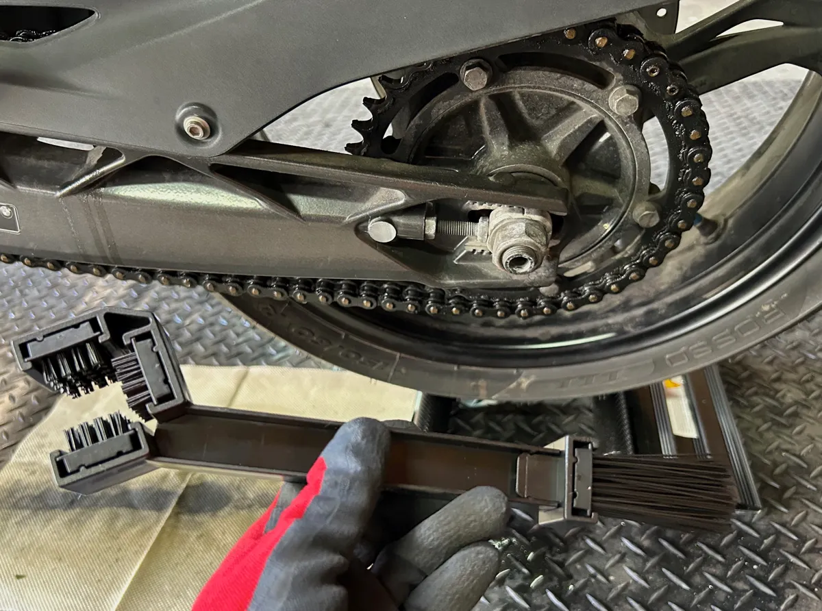 気を取り直してお次は「MCチェーンブラシ」で汚れが浮いたチェーンを磨いていきますが、これがチェーンにスポッとハマる3点ブラシ仕様なので、どうやっても汚れが落ちてしまいますし…反対側の1点ブラシでのピンポイントクリーニングも可能でございます。