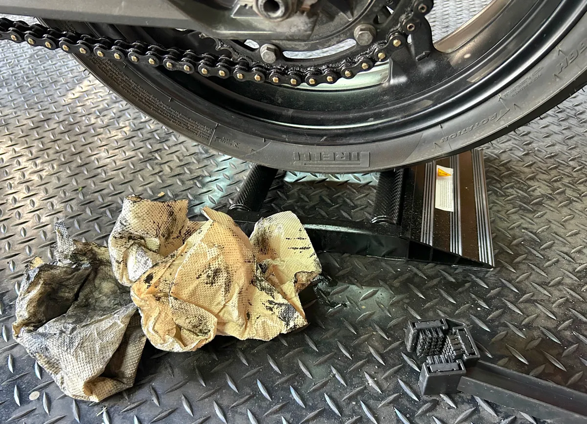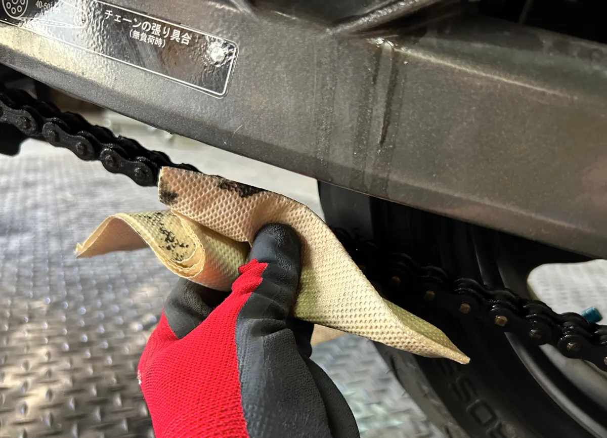 最後はブラシで磨いたチェーンをウエスでフキフキしていきますが…なんせチェーンの汚れはグッテグテのベロベロリンなので…くれぐれも手や服に付かないようにお気をつけ下さい…