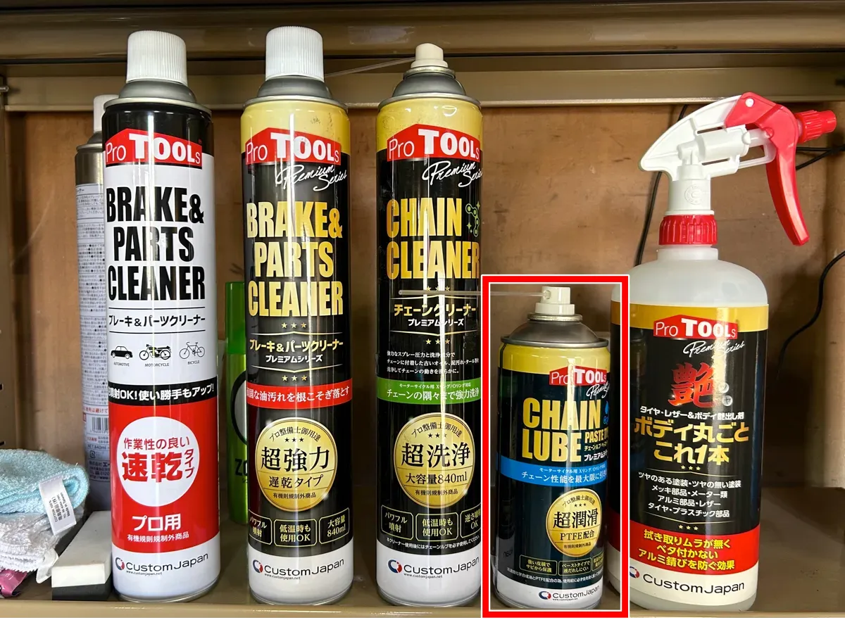 今回僕が奥様バイクのチェーンメンテで使ってみた「ProTOOLs プレミアムシリーズ チェーンルブ ペーストタイプ」とは、東京モーターサイクルショーにも出展している「SHAD・TIMSUN」の日本総代理店で、数多くのプライベートブランドを展開するカスタムジャパンのチェーンルブです!
