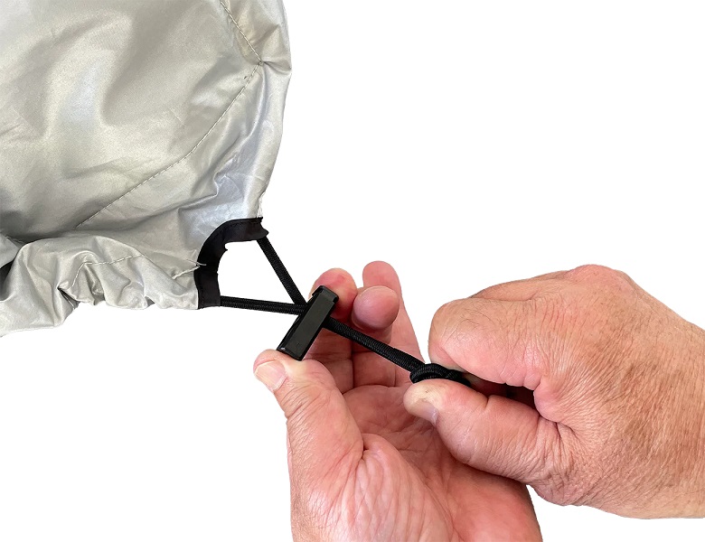 カバーの固定も簡単で、淵の全周囲に内蔵されているラバーコードを引っ張りだして、ステップなどの突起物に引っ掛ければOK。しかもカバー本体と収納用ポケットが一体化した造りなので、使い終わった後もサッと折りたたんでコンパクトに収納。フルカバーほどかさばらないので、ツーリングバッグにも放り込んでおけるので携帯性も高い。