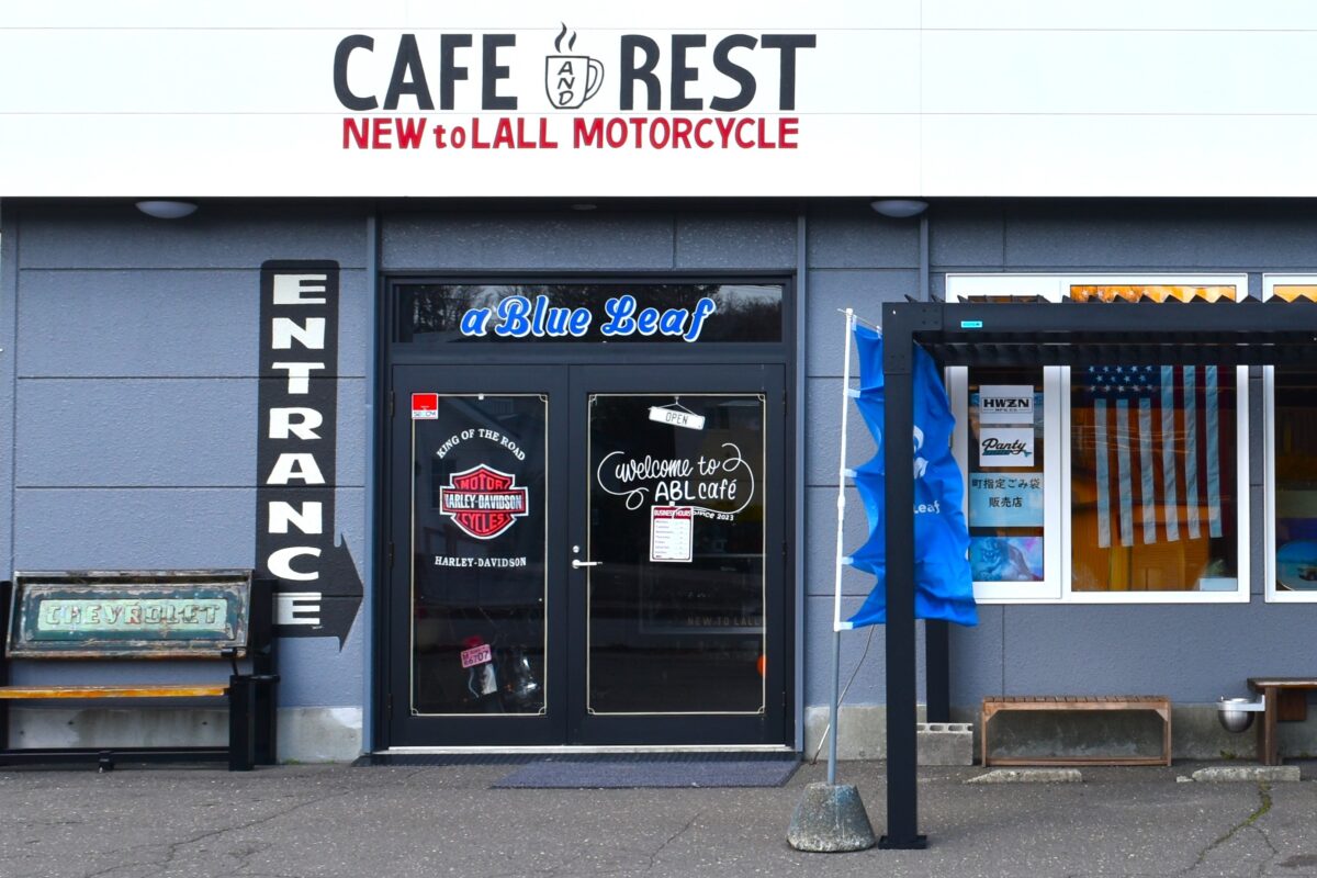 「a Blue Leaf」は、追分地区と千歳を結ぶ道沿いにあります。大きな建物にCAFE&REST、その下にはNEW to LALL MOTORCYCLEの文字。さらには宅配便とカレーの幟が風になびいています。「どんな店なんだろう」と思い、検索してみるも情報はわずか。百聞は一見にしかず。 謎を確かめるべく店内に突入しました。