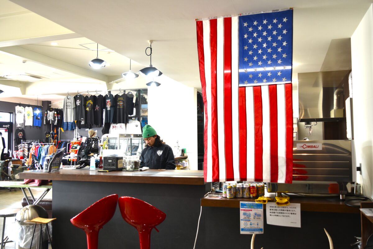 ドアにはハーレーダビットソンのロゴマークが貼られています。”いかにも”な激シブのオヤジさんが出てきて「カワサキのダートバイクに乗る奴なんてウチの店に似合わないんだよ!」と恫喝されるかと思いましたが、若いスタッフさんがニコヤカに迎えてくれました。