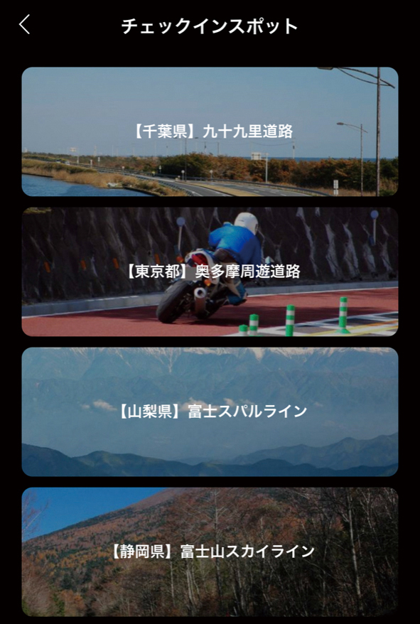 使い方は至って簡単!まずは「Riders Square」のアプリを起動。そうするといくつかコンテンツが表示されるが、その中にある「チェックインスポット」にはすでに多くのおすすめツーリングスポットやコースがインストールされているので、この中から選べばあれこれ悩まずにすむので便利だ。