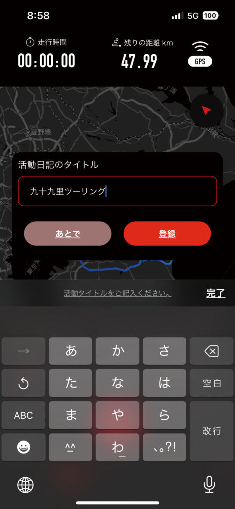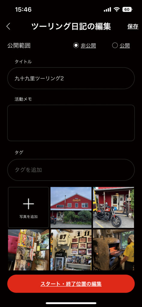 そしてSTARTを押すと、「ツーリングを開始しますか?』という表示が出るので、開始するをプッシュ。すると活動日記のタイトルを入力できるので、その時の場所名などを登録すれば完了だ。これで今回のツーリングのログが記録される。
