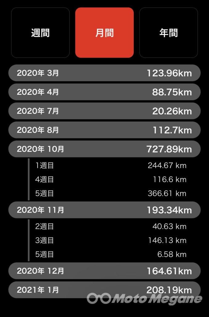 マイページ画面の「合計距離」をタップすると現れるのが上の画面。アプリを使った総走行距離を表示できるので、今まで何となくだった距離の把握もしっかりできる。さらに指定した期間(週間・月間・年間)にどれだけ走っていたかの一覧表示も可能。乗っていない期間も分かる。