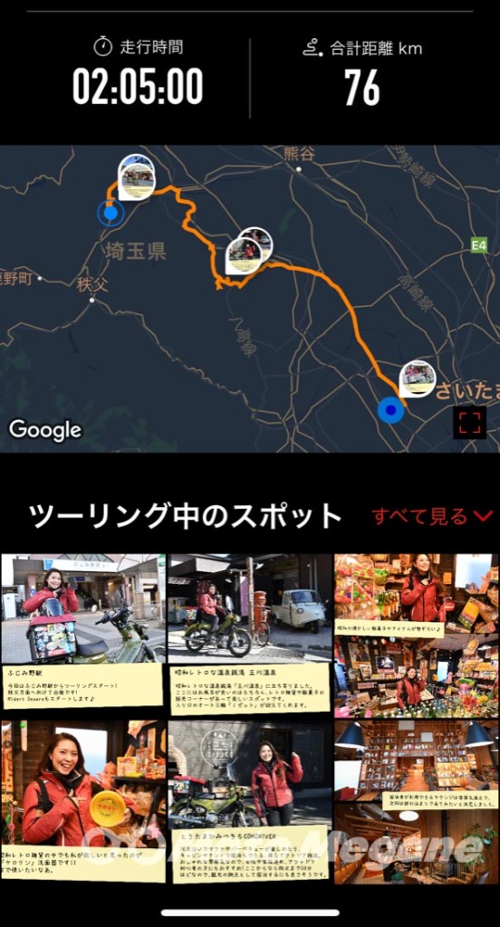 このように通ったルートが地図上に保存され、どこに立ち寄って写真を撮ったかも一目瞭然。走行距離や時間も記録されます。