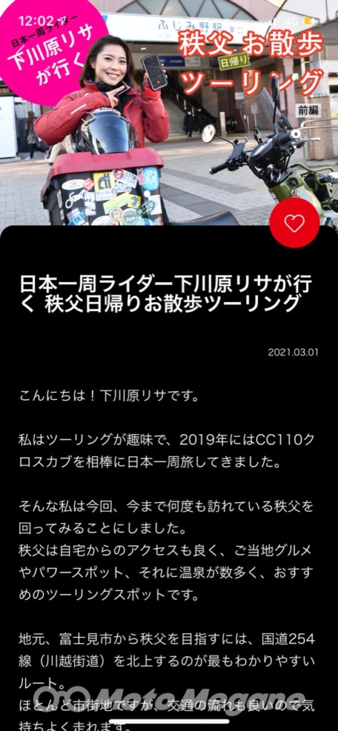 こんにちは!下川原リサです。私は、ツーリングでは必ずスマートフォンをナビに使っているのですが、GPSでログが取れるアプリ「ライダース·スクエア」は使ったことがありませんでした。