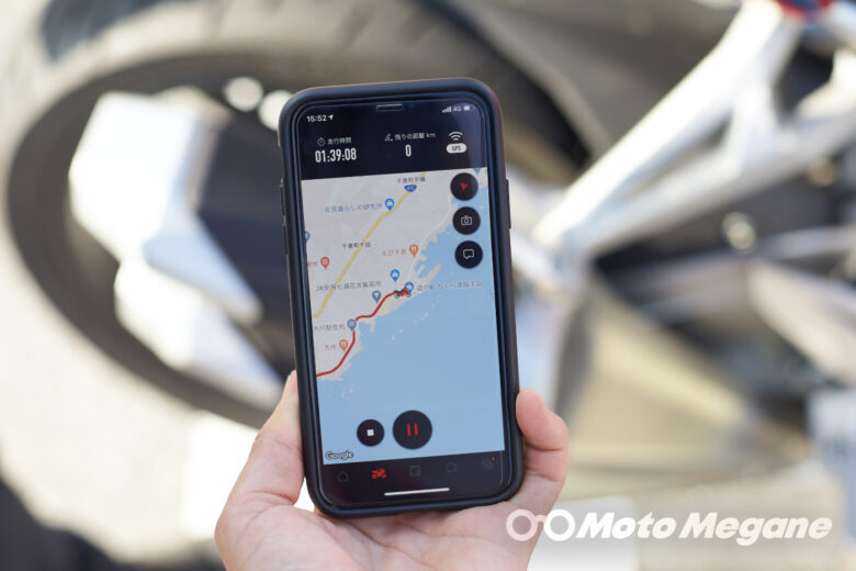 アプリを起動し、「スタート」させると、走行距離と走行時間が、位置情報と合わせてすべて記録され、さらにアプリから写真を撮って保存すれば、位置情報から走行ルート上に写真が保存される。