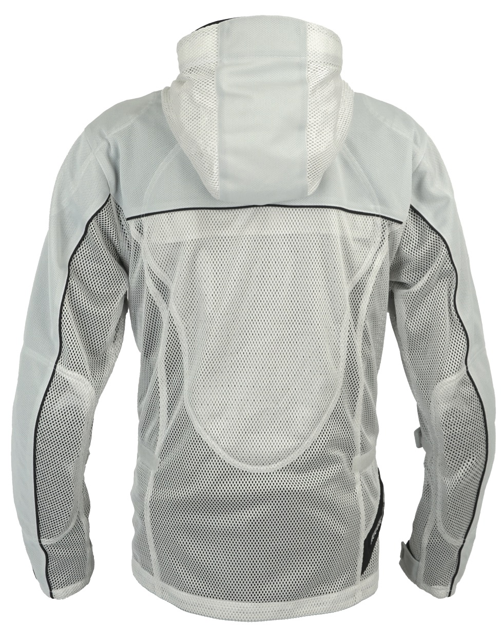 近年の流行であるフードのあるアウトドアスタイルを取り入れた「ダイレクトエアメッシュパーカーFP」。前身ごろ、後身ごろとも胸から下の部分のメイン素材には“ビッグホールメッシュ”を採用し、胸上、腕の外側にはやや目の細かい“スパックスメッシュ”をレイアウト。この“スパックスメッシュ”はUVカット効果があるほか、“ビッグホールメッシュ”よりもしっかりした生地感の素材なので、高速道路などでのバタツキが少なく安心感も高い。胸、肩、肘、脊椎パッドを標準装備し、フードを取り外しての使用も可能。