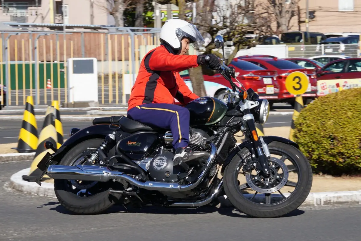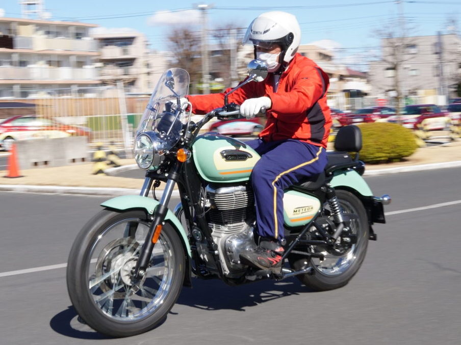 「今回、メテオ350とスーパーメテオ650の両方を乗らせてもらいましたが、取り回しに関しては350ccのメテオ350と変わらないくらいスーパーメテオ650は扱いやすいですね。足つき性がよく、タンクあたりの幅も私にちょうど良くて乗りやすかったです」
