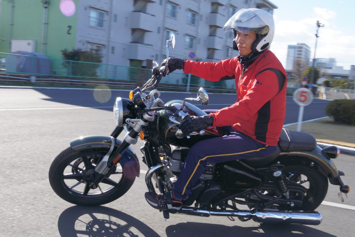 「教習所で乗るのはネイキッドタイプのバイクなので、アメリカンやクルーザー系のモデルが採用するフォアードコントロールは多少の違和感が最初は感じるかもしれません。ただスーパーメテオ650の場合はとにかくハンドリングが素直なのですぐに慣れると思いますよ」とのことだ。