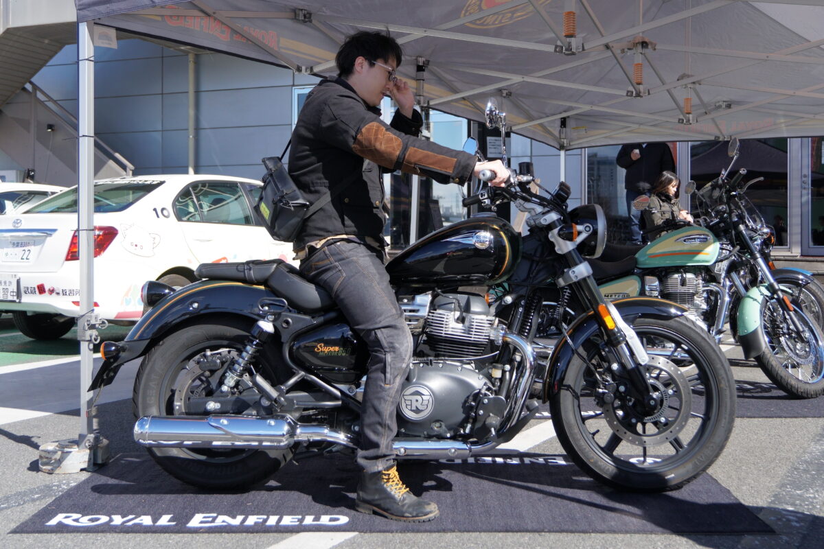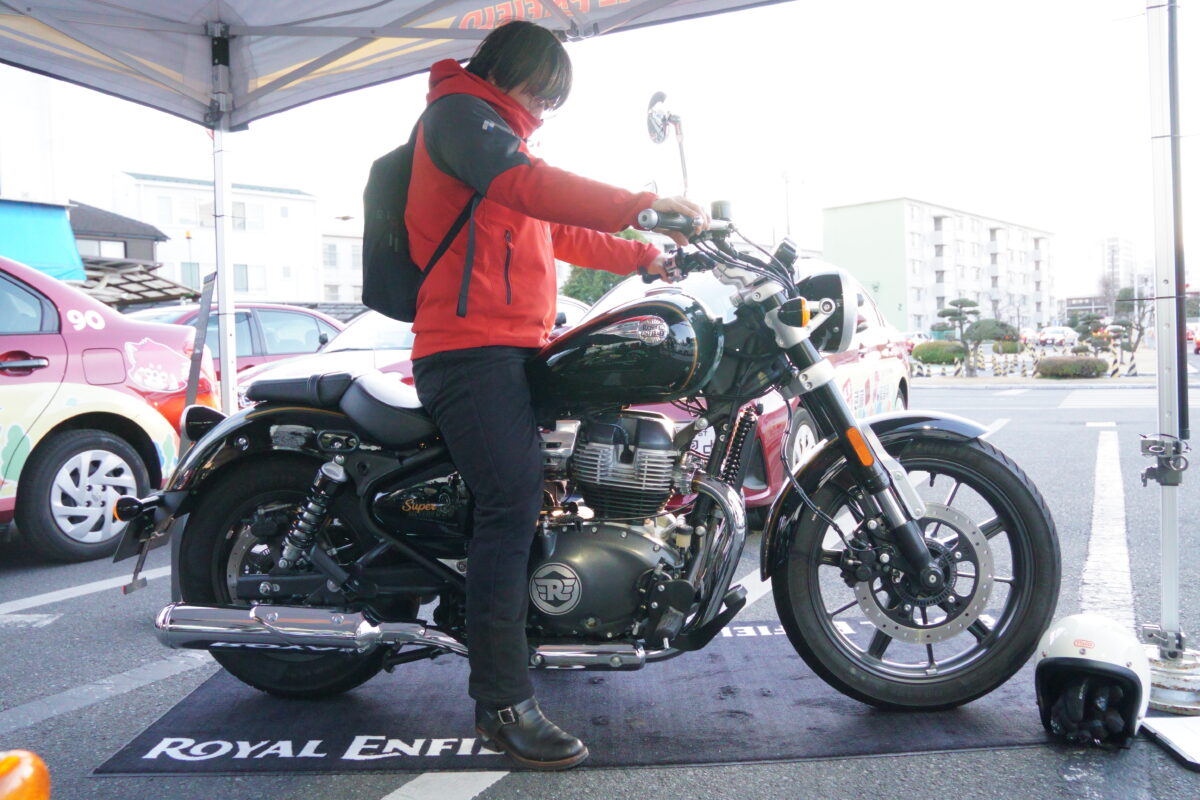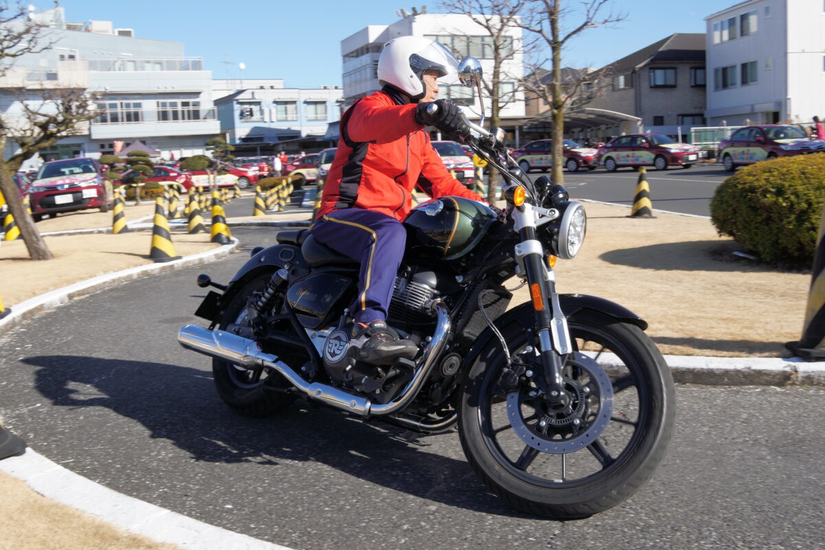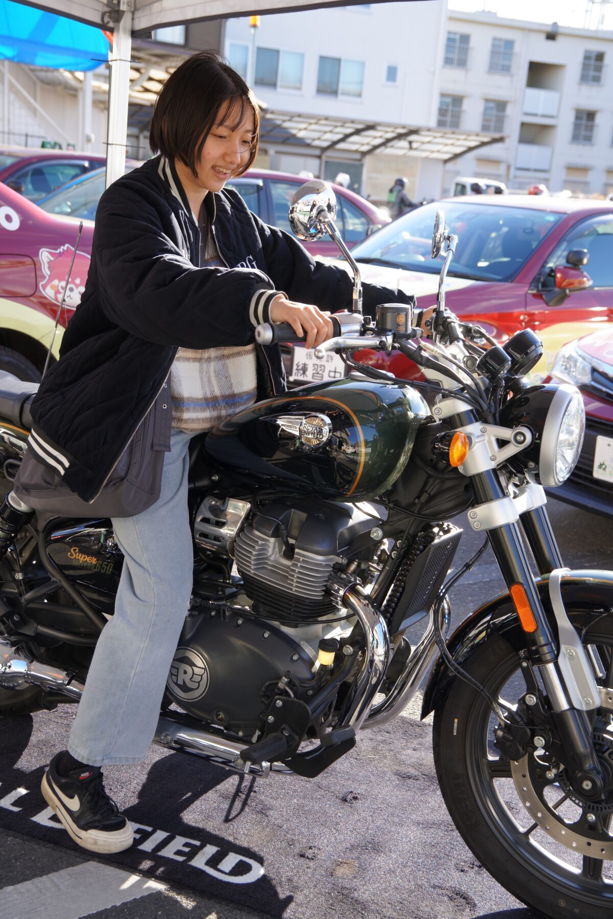 アキバさんは、W800やハーレーダビッドソンなど“かっこいいバイクに乗ってみたい”とバイクの免許の取得を決意した。「メテオ350とスーパーメテオ650の両方を跨らせてもらいましたが、やっぱりメテオ350のほうが軽いんですね。ただスーパーメテオ650の方は大型バイクだけあってずっしりとした安定感があるのがいい。足つきに関しては教習で乗っているNX400よりもいいくらいなので、免許さえ取ってしまえば不安なくスーパーメテオ650に乗ることができそうです」。