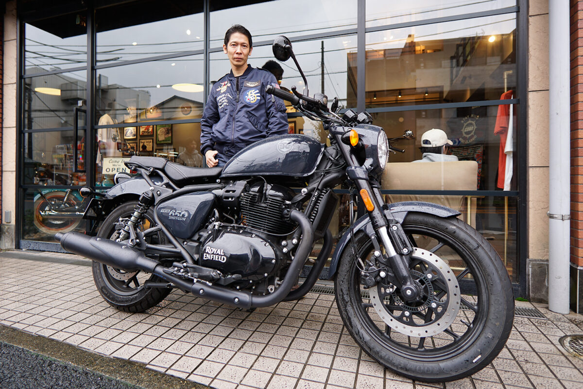 初の大型&初のロイヤルエンフィールドとなるショットガン650を楽しむワカイさん。