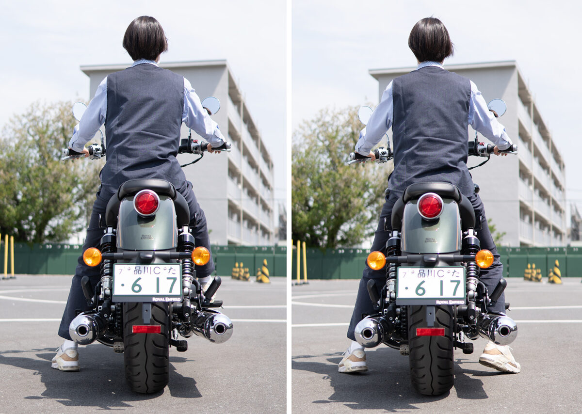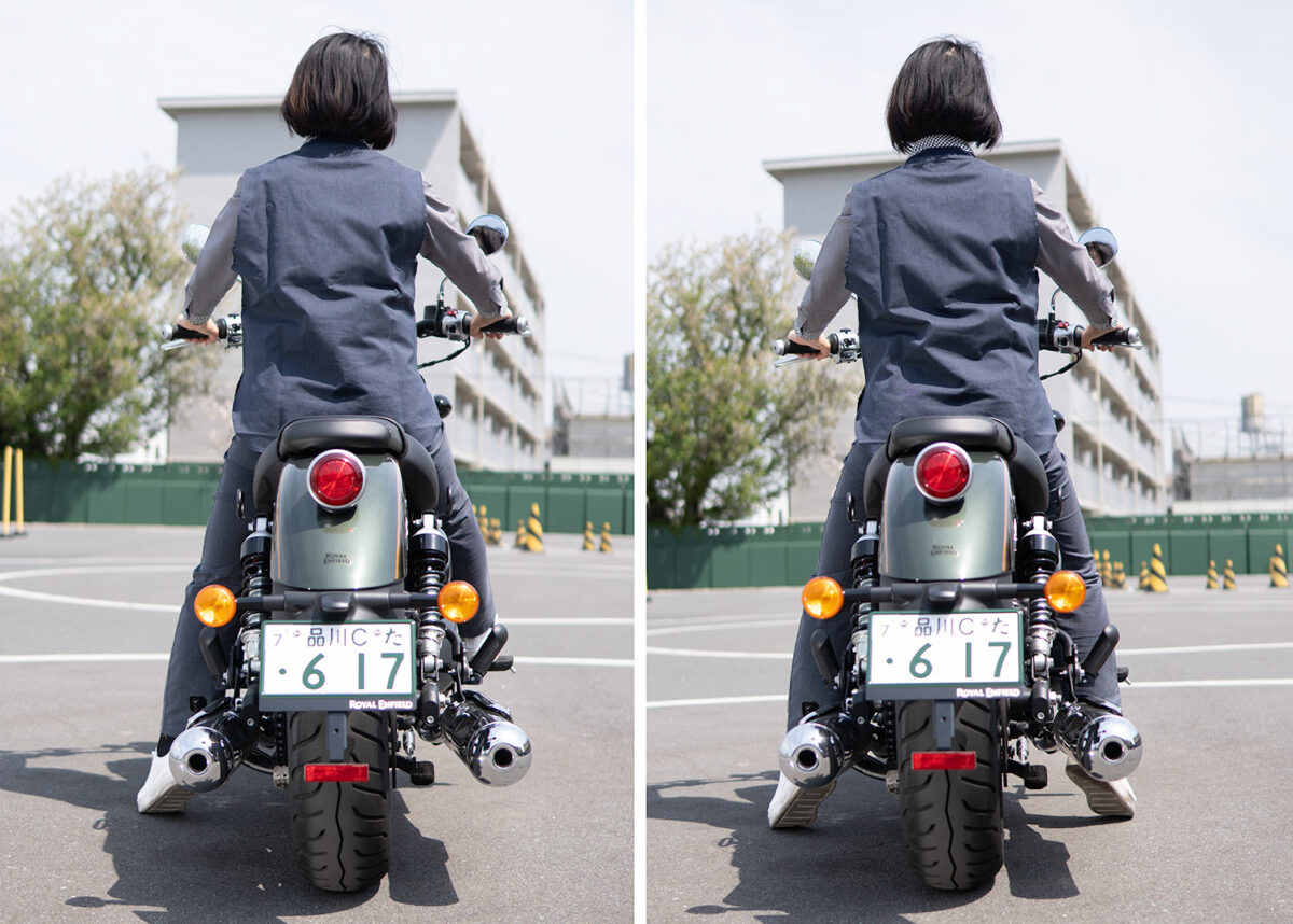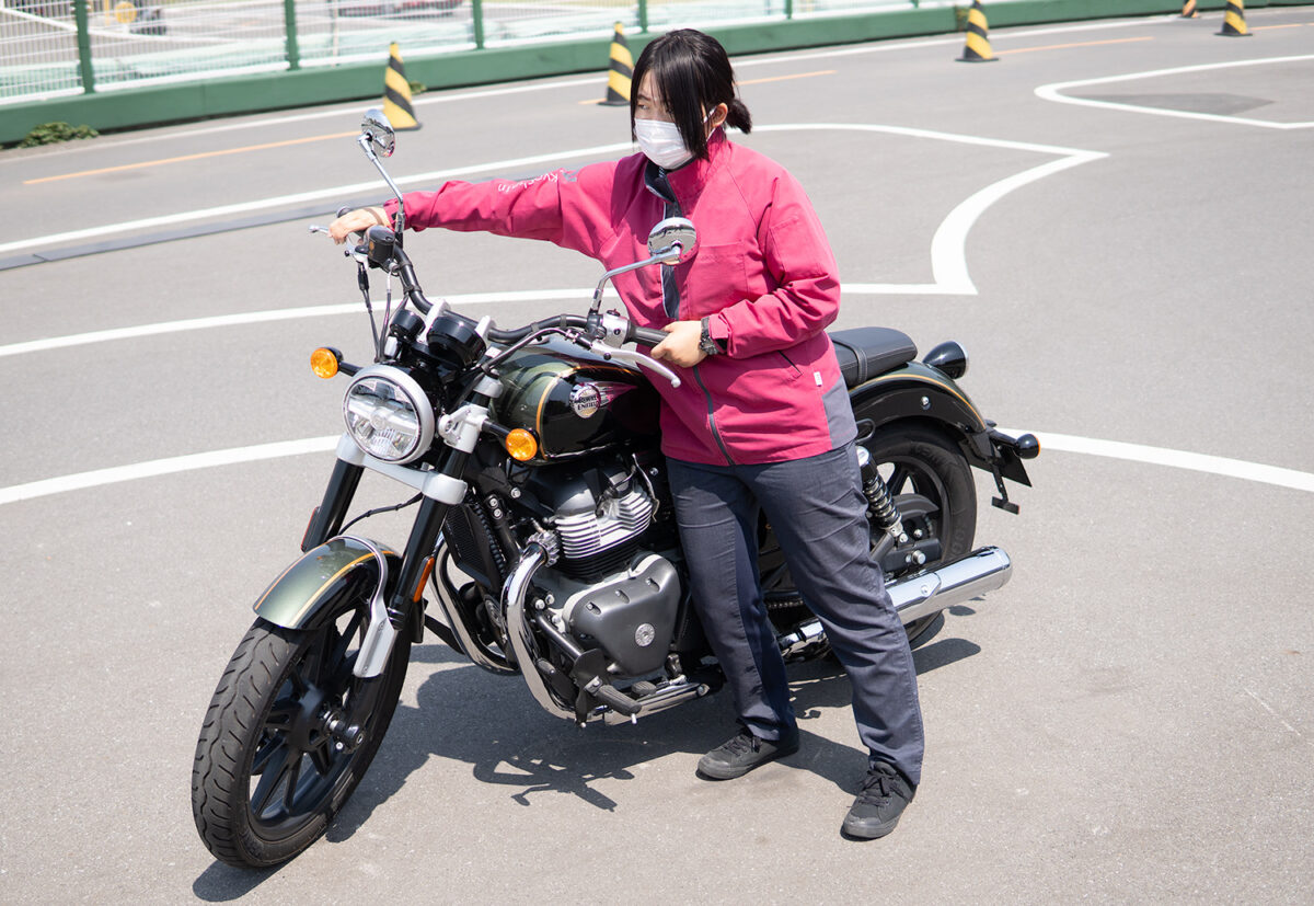 夕奈さん取り回しは、想像と違って重さをとくに感じなくて楽に動かせました。ハンドルをフルに切ってもヒジに余裕があってブレーキも問題なく握れました。ただ、バイクを身体で支える位置が他のタイプと比べて低く感じて、何かあった時に支えられるか少し不安でした。