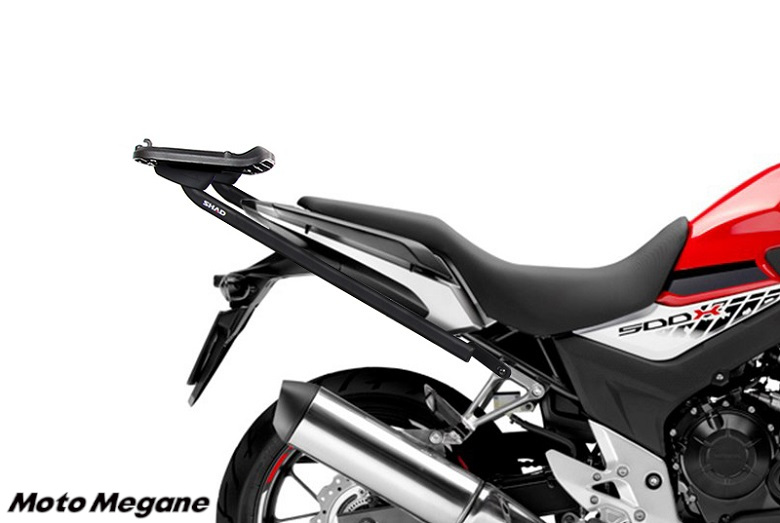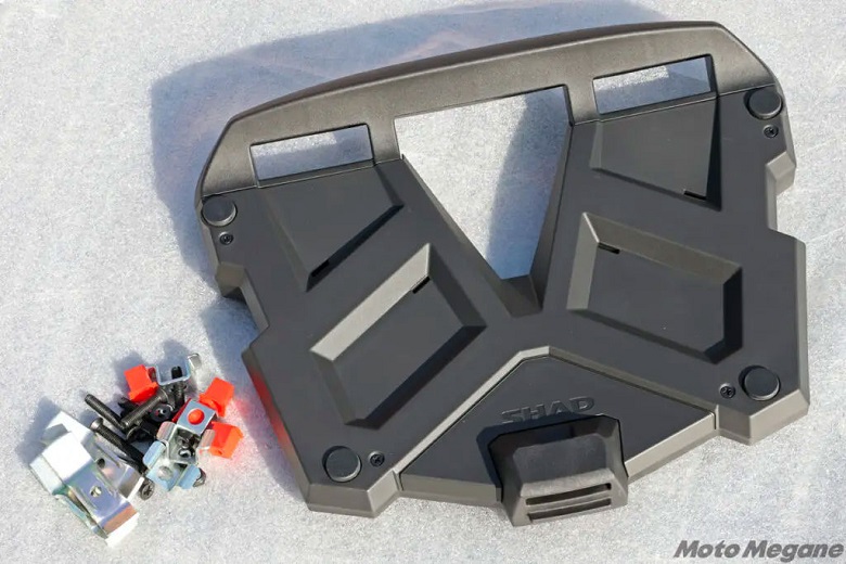 写真は400X専用に設計されたトップマスターフィッティングキットに、トップケースを装着するためのベースプレートが搭載された状態で、ベースプレートは別売となる。