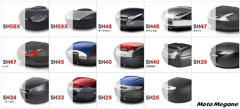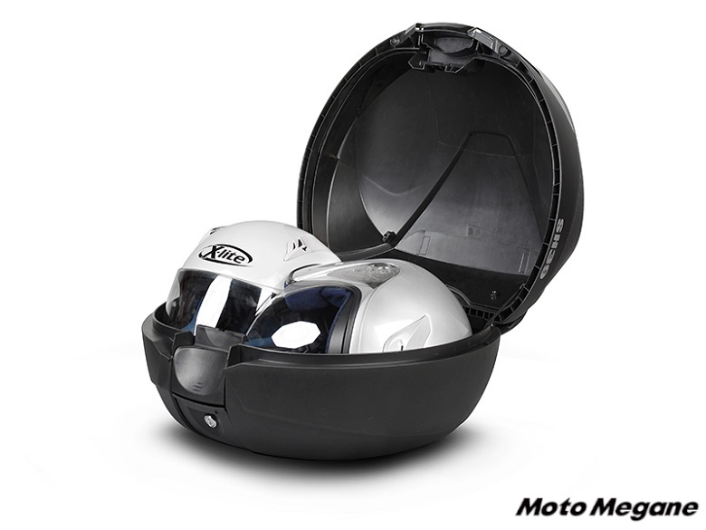 写真のSH39はトップケースの中では中型の部類で、フルフェイスヘルメット1個&ジェットヘルメット1個が入る容量を確保している。装着するにはベースプレートMが必要となる。他にもベースプレートMで対応できるモデルはSH40、SH40CG、SH44、SH45、SH47がある(※SH26、SH29、SH33、SH34の小型トップケースも搭載可能)。