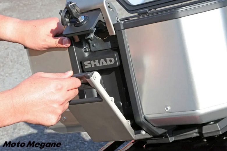 TR48を装着した例。アルミ製で頑丈なだけに、キー周辺の構造も質実剛健になっている。なお、TERRAおよびトップケースには写真のようなサイドケースもラインナップされており、装着する場合には専用アタッチメントの『4Pシステムフィッティングキット』を導入する必要がある。