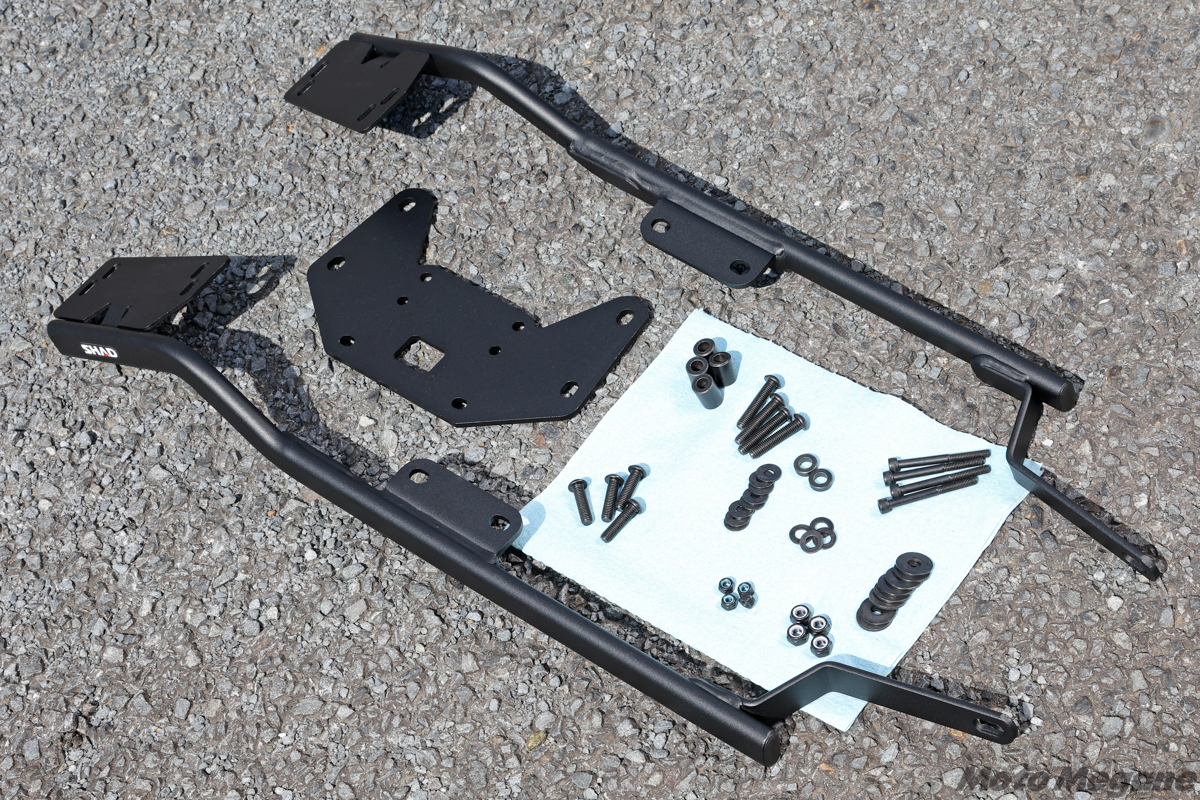 車体にリアキャリアが装着されている場合、このベースプレートを比較的簡単に車体装着できることも多く、愛車の積載力をすぐに高められるのだが、とくにスポーツタイプのバイクは、リアキャリアを装着していることは稀。そこで活躍するのが、車種専用設計のSHAD純正パーツとなる「トップマスターフィッティングキット」だ。