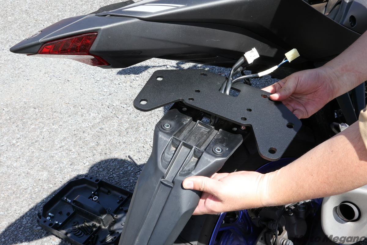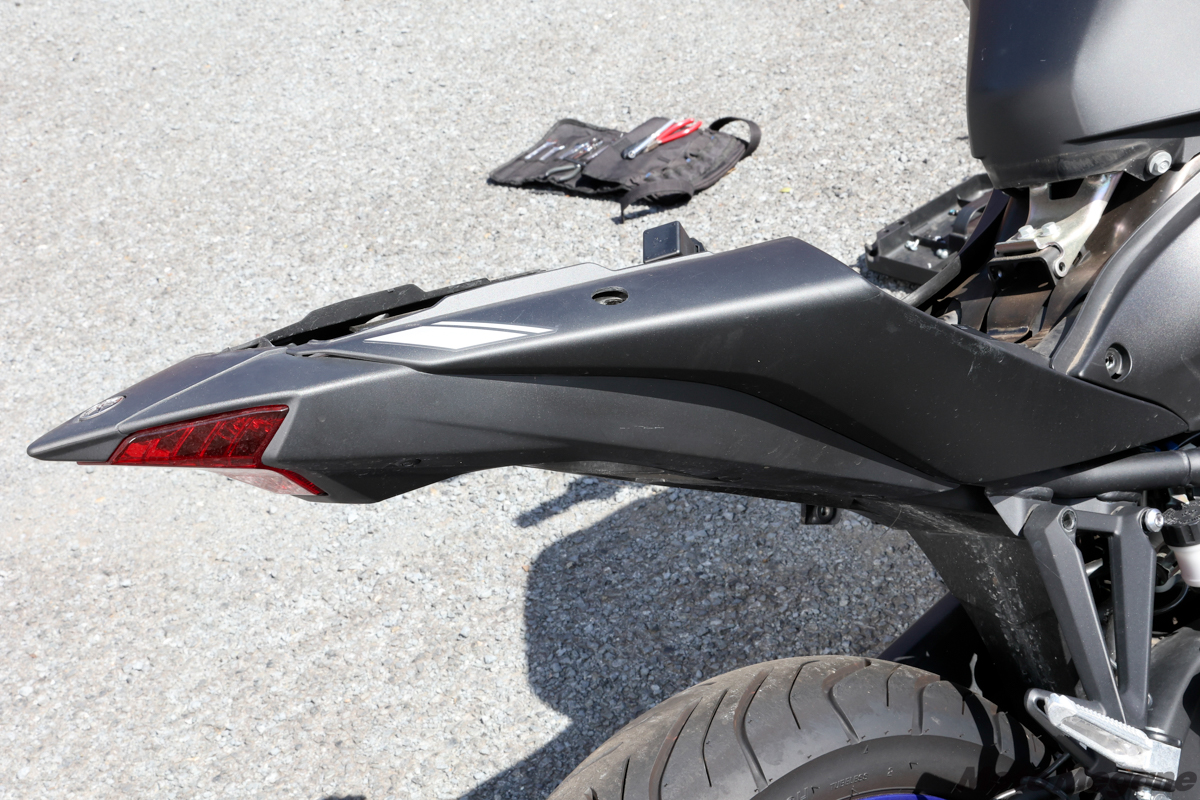 倒立フロントフォークを新採用した、2019年型以降のYZF-R3および2020年型以降のMT-03に適合するトップマスターフィッティングキット(品番26594873)は、左右分割構造となる2本のアームを中心に構成されている。これを支えるために、前側はタンデムステップホルダーを一度緩めて共締め。リア側は、キットに含まれているプレートを、リアフェンダーを兼ねたナンバープレート&リアウインカーステーとテールカウルの間に挟み込む必要があるため、ステーまわりをごっそり取り外さなければならない。