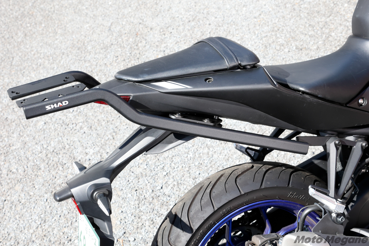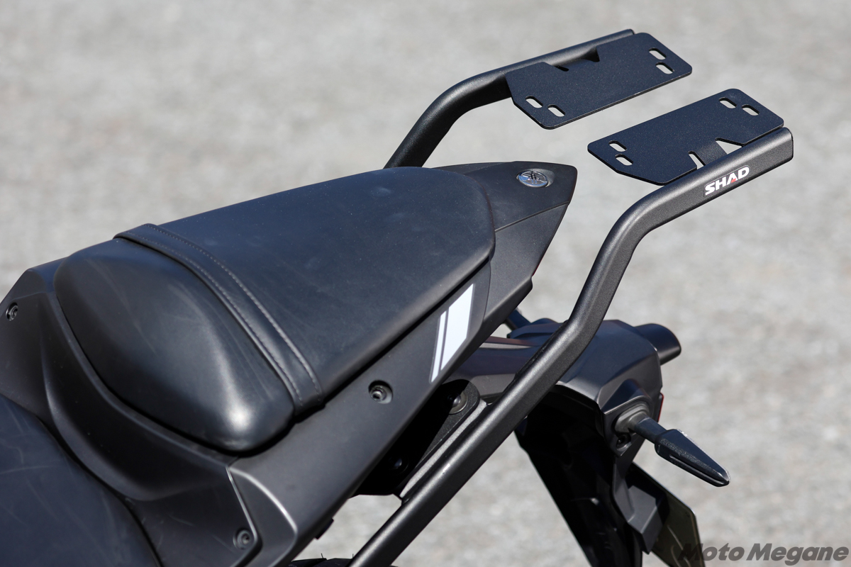 例えば、320cc水冷並列2気筒エンジンを搭載したミドルスーパースポーツのYZF-R3や、これをバーハンドル化したストリートファイター系ネイキッドのMT-03は、そのアグレッシブなルックスとは裏腹にフレンドリーな操縦性も備え、ツアラーや日常の足としても使いやすい。しかし、段差のある前後セパレートシートで、後席は小さめ。ツーリングで必要な荷物を積むのはシートバッグなどを使わないと難しいが、シートに荷物を積むことでタンデム機能も失われてしまう。しかしSHADのリアボックス+トップマスターフィッティングキットにより、積載性の問題は完全に解決。SHADの樹脂製トップケースは防水性や防犯性にも優れ、フルフェイスヘルメットも収納できる設計なので、YZF-R3やMT-03の利便性は大幅に向上する!