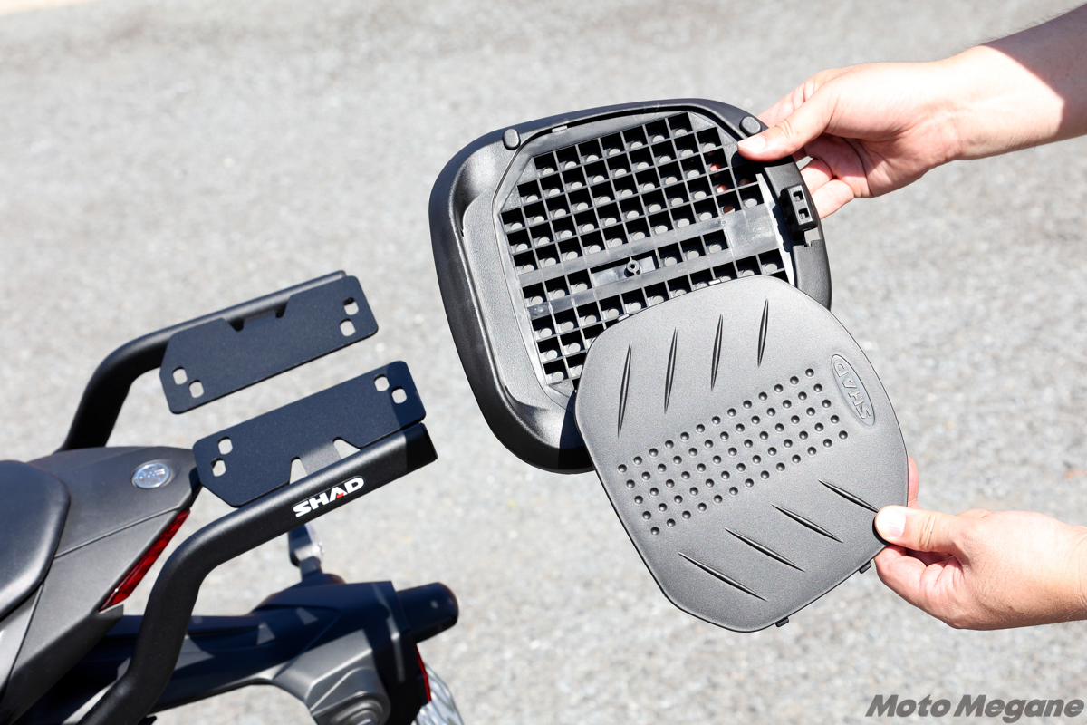 トップマスターフィッティングキットが車体に装着されたら、そこから先はとても簡単。SHADの樹脂製トップケースに同梱されている汎用のベースプレートを、ボルト&ナットでフィッティングキット後部に装着して、あとはトップケースのロック機構を操作してケースを固定するだけだ。