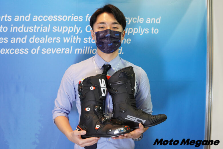 安全性の高さからヨーロッパを中心にストリートからレースシーンまで、世界中のライダーに愛されているイタリアンブランドのSIDIだが、そのハードな見た目に反した履き心地の良さや動きやすさも製品の特徴となっており、機能を追求したデザイン性の高さも人気の一つとなっている。岡田商事のブース展示では、このような魅力的な海外製品を数多く取り扱っており、憧れの製品を実際に手に取ることによって、もっと詳しく、もっと身近に、もっと魅力的に感じることができる。さらにブースでは、Webでの情報や英語表記のカタログだけでは伝わりにくい事でも、製品に詳しいスタッフにアテンドしてもらえるというのも頼もしい。