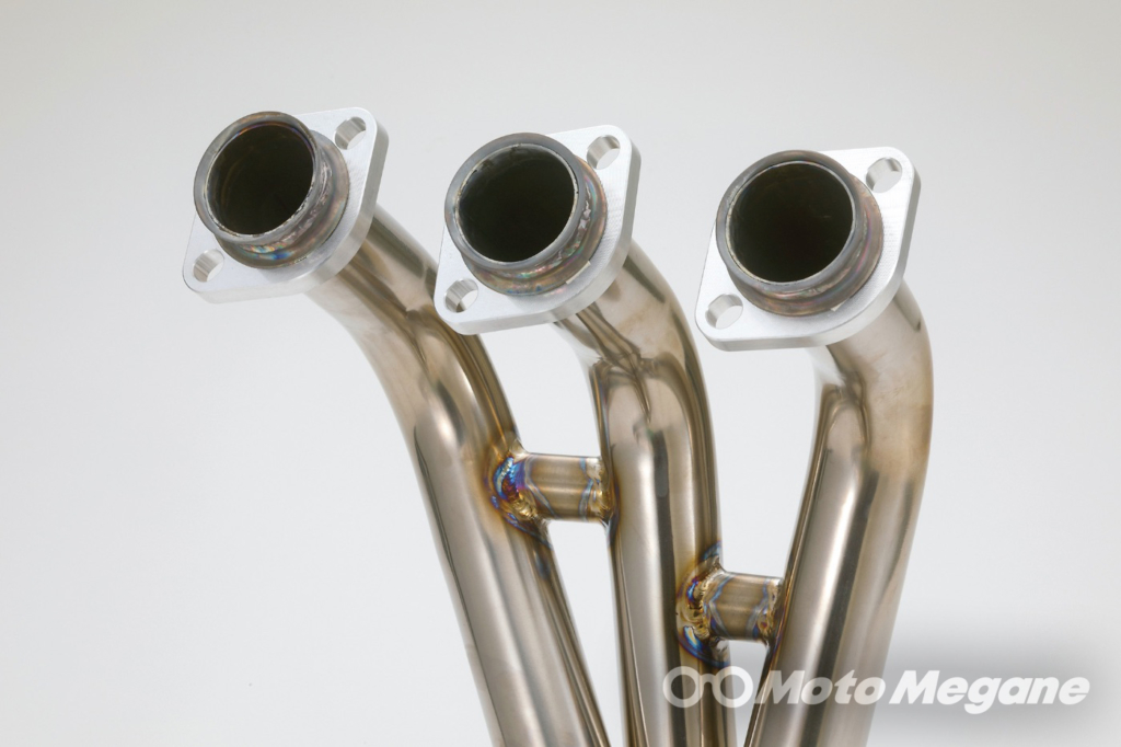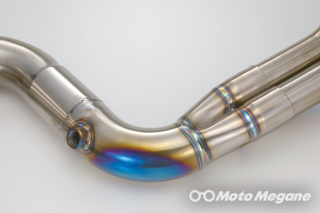 φ38.1mmのエキゾーストパイプ部を見る。主要構成素材にはすべて超軽量チタン材を採用、圧倒的な軽量化を達成している。3本のエキパイ間は純正同様にバイパスバイブで繋がれている。
