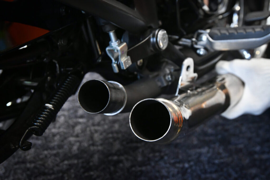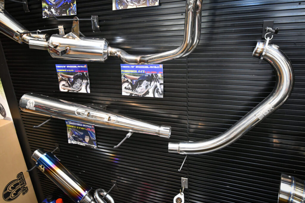 今回のGB350用のように、エキパイだけを交換するPOWERBOXシステムは、歴代のヤマハセロー250でも大ヒットを記録したSP忠男伝統のエキゾーストシステムです。パイプの曲げや太さはノーマルとは異なりますが、その肝となる構造は内部にあります。このPOWERBOXパイプでは、エキパイの内部に細いパイプを仕込むことで、GB350の単気筒フィーリングをより明確に打ち出すことに成功したといいます。