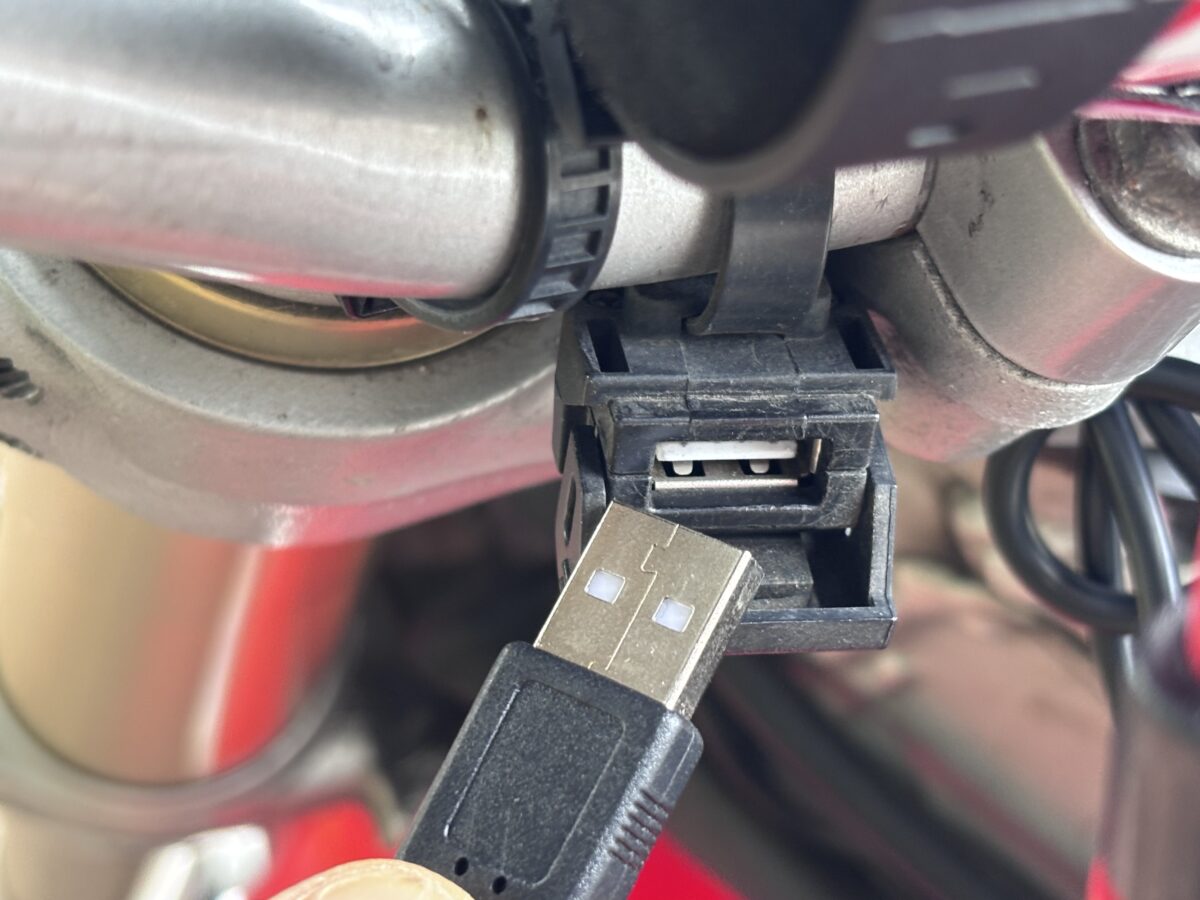 バイクへの取り付けも10mmレンチがあればOK。外径22.2mmの一般的なバーハンドルはもちろん、大径のファットバーやアメリカ規格のハンドルにも対応している。電源はUSBポート(Type-A)に接続するだけだ。
