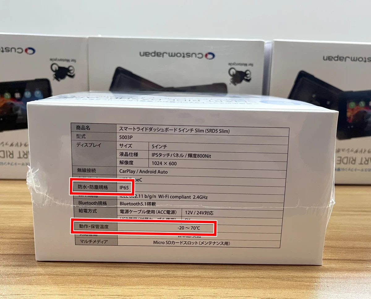 SRD 5 Slimは「IP65」の防塵・防水仕様になっており、雨天時もCarPlayやAndroidAutoを使ってのナビゲーションが問題なく行えます。
